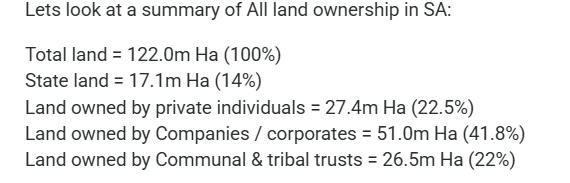 36% of all land is in government or tribal control already and 41% owned by companies which have shareholders. This leaves 23% of the land which a large portion will be housing which is made up of over 5 million properties having active mortgages.