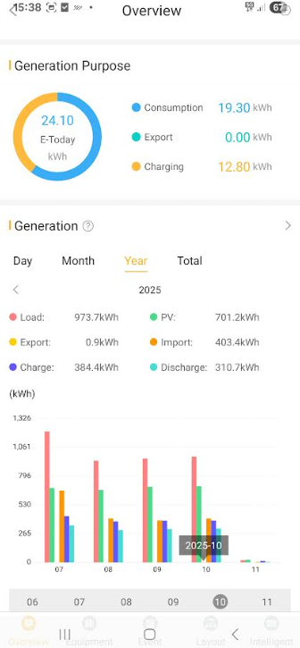 Import 403kwh vs last month 380.6 kwh Discharge 310kwh vs last month 307.6 kwh