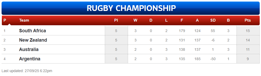 South Africa just have to win against Argentina next week to win the rugby championship as New Zealand would need to beat Australia by a minimum of 61 points plus whatever SA beats Argentina by. This is highly unlikely as the Argentinians are out the tournament with no chance of victory so they have nothing to fight for besides pride. The match is being played on neutral soil at Twickenham in the UK which will seem like a home match for the South Africans.