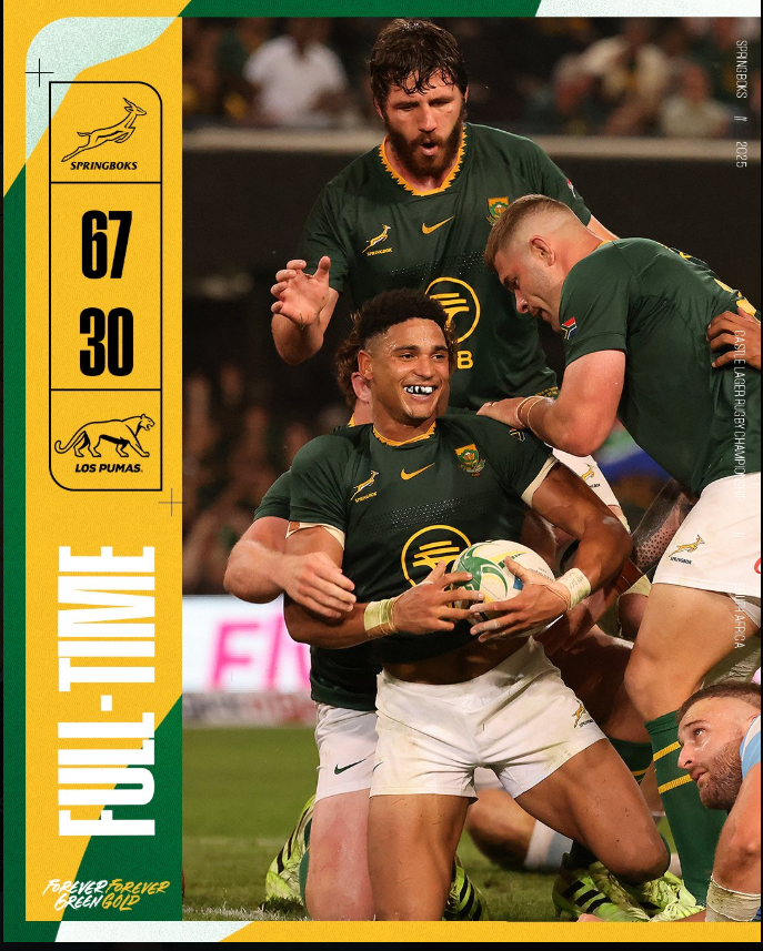 This evening the SA rugby team romped home to a 67-30 victory over Argentina by outscoring them 9 tries to 3. Two weeks ago the SA team outscored the All Blacks by 36 points to nil in the second half and today they outscored the Argentinians 42-7 in the second half. This is not by chance and all about draining their opponents energy and then striking for the kill.