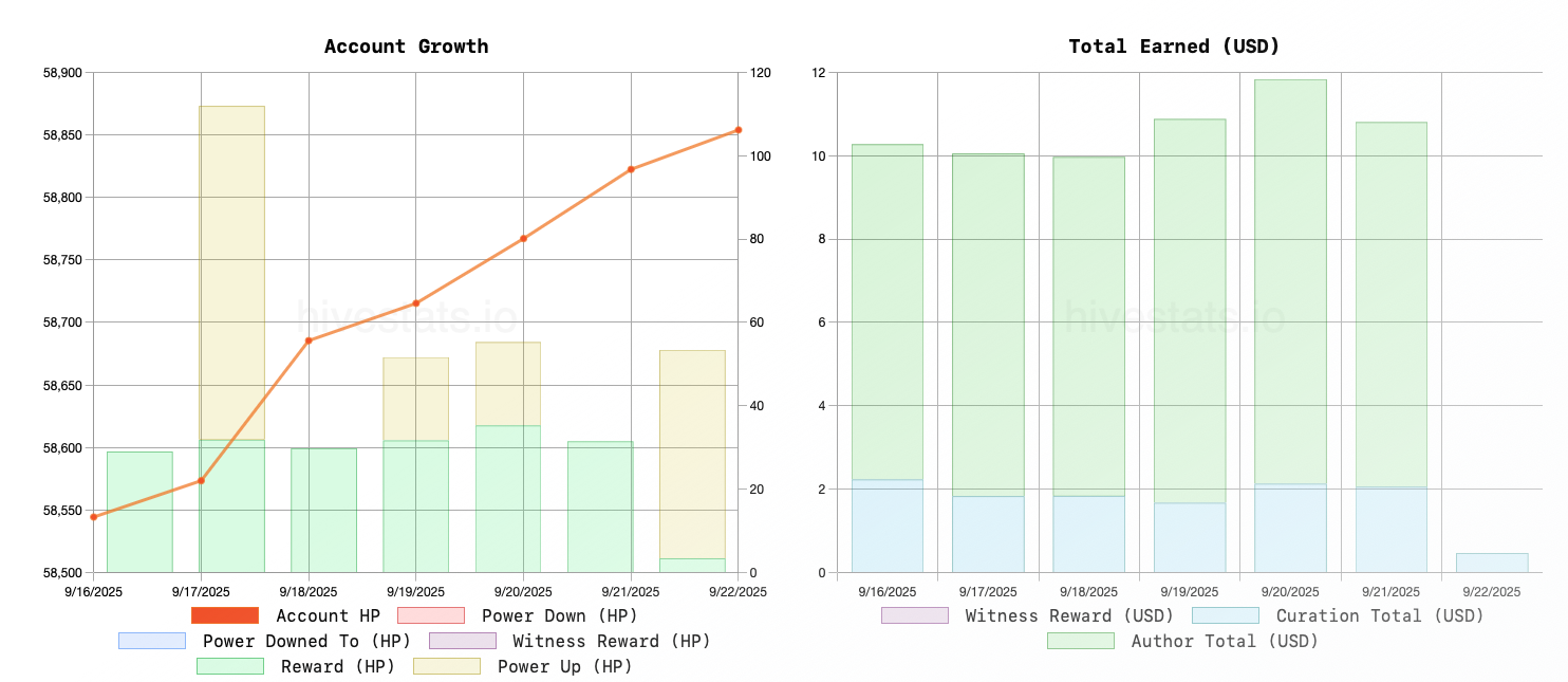 Last week I liquidated some of my H-E tokens and moved the money to Hive; combined with the weekly total from posting I increased by 435.61, bringing me to 58854.53 total Hive Power. That’s 98.1% of my goal!