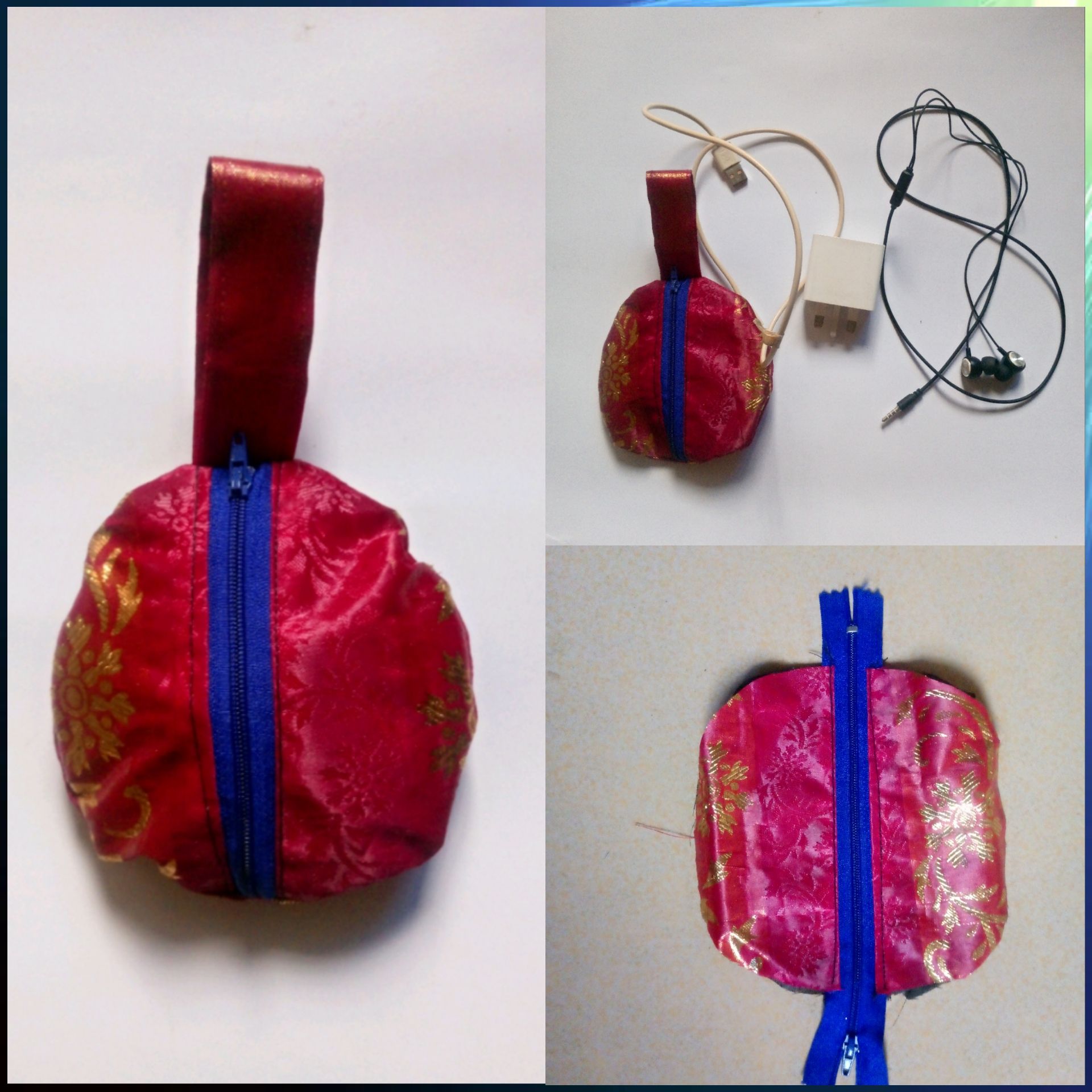 Round keychain pouch for ear piece and charger made from fabric scraps