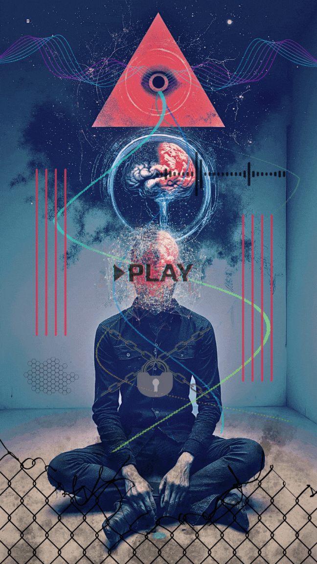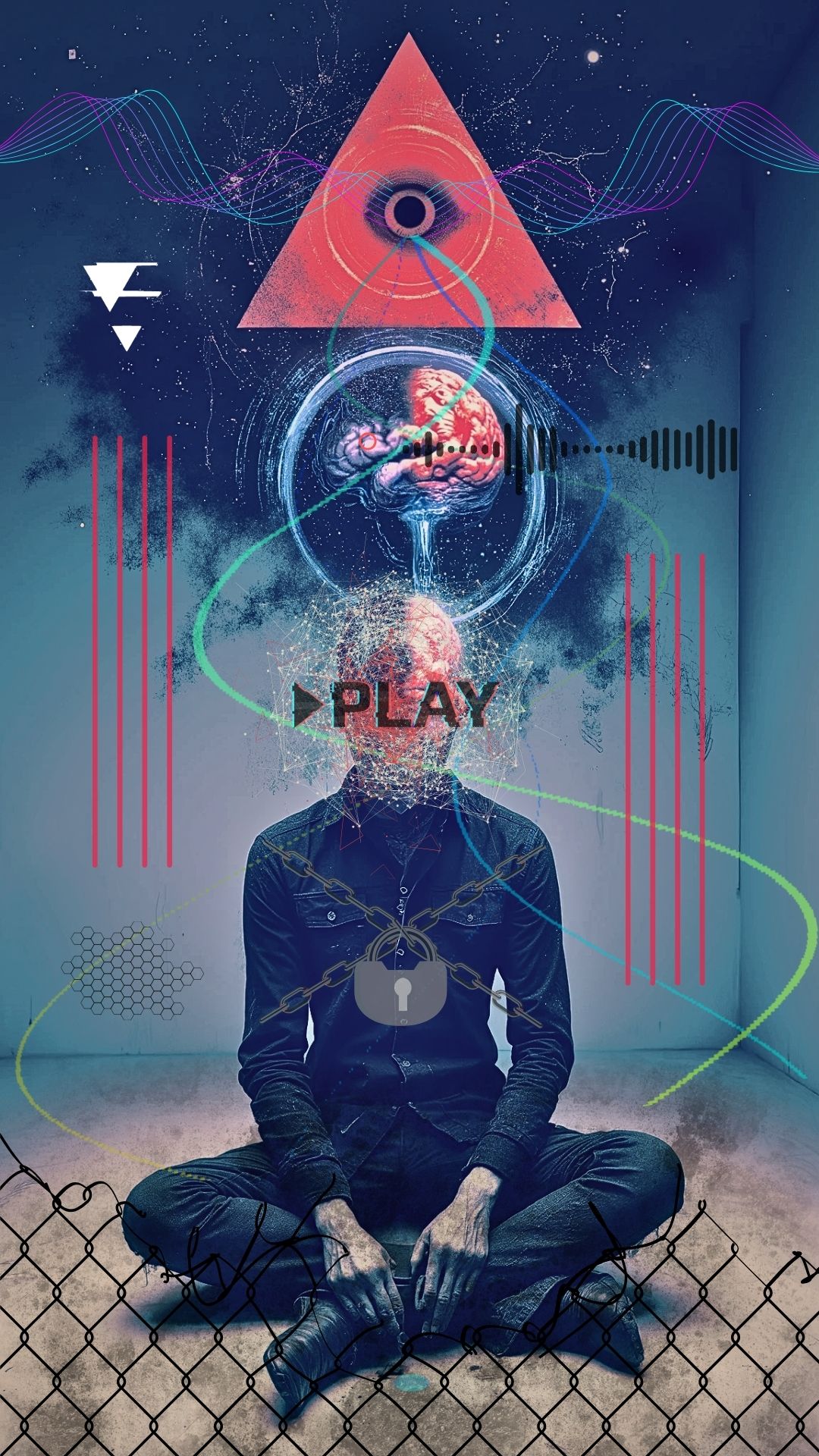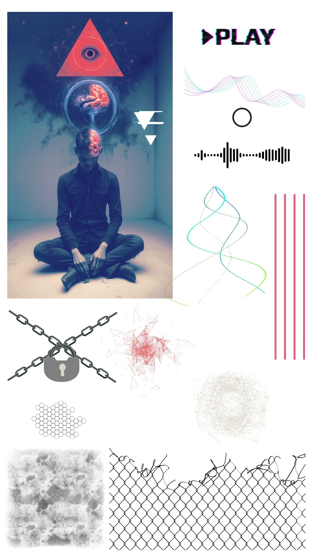 **Creative Process:** First, I generated the base image in **Ideogram**, and then I took it to **Canva**, where I gave it movement and meaning, incorporating these elements: metal mesh, Play, abstracts, padlock vector, geometric shapes, lines, and various GIFs.