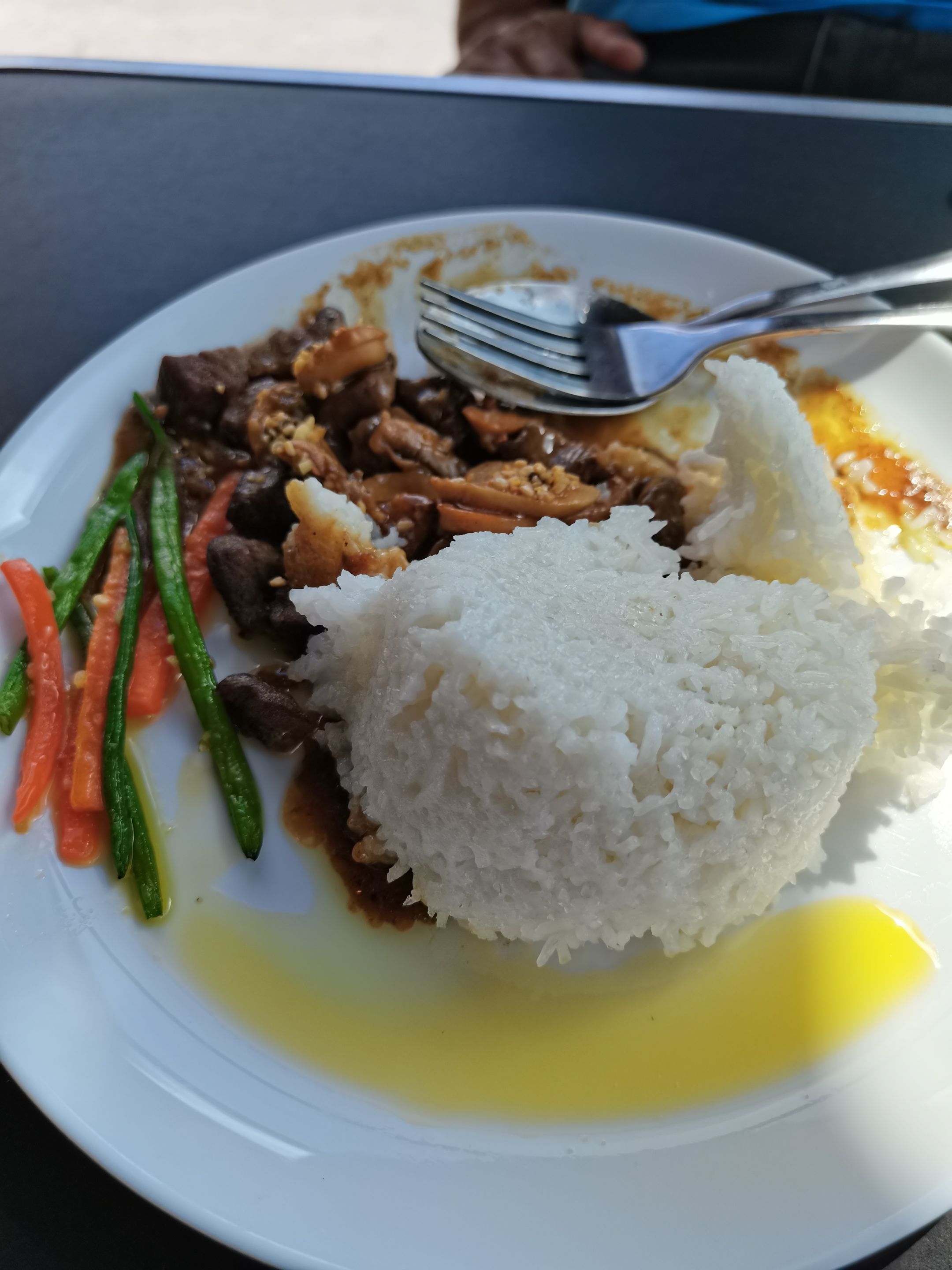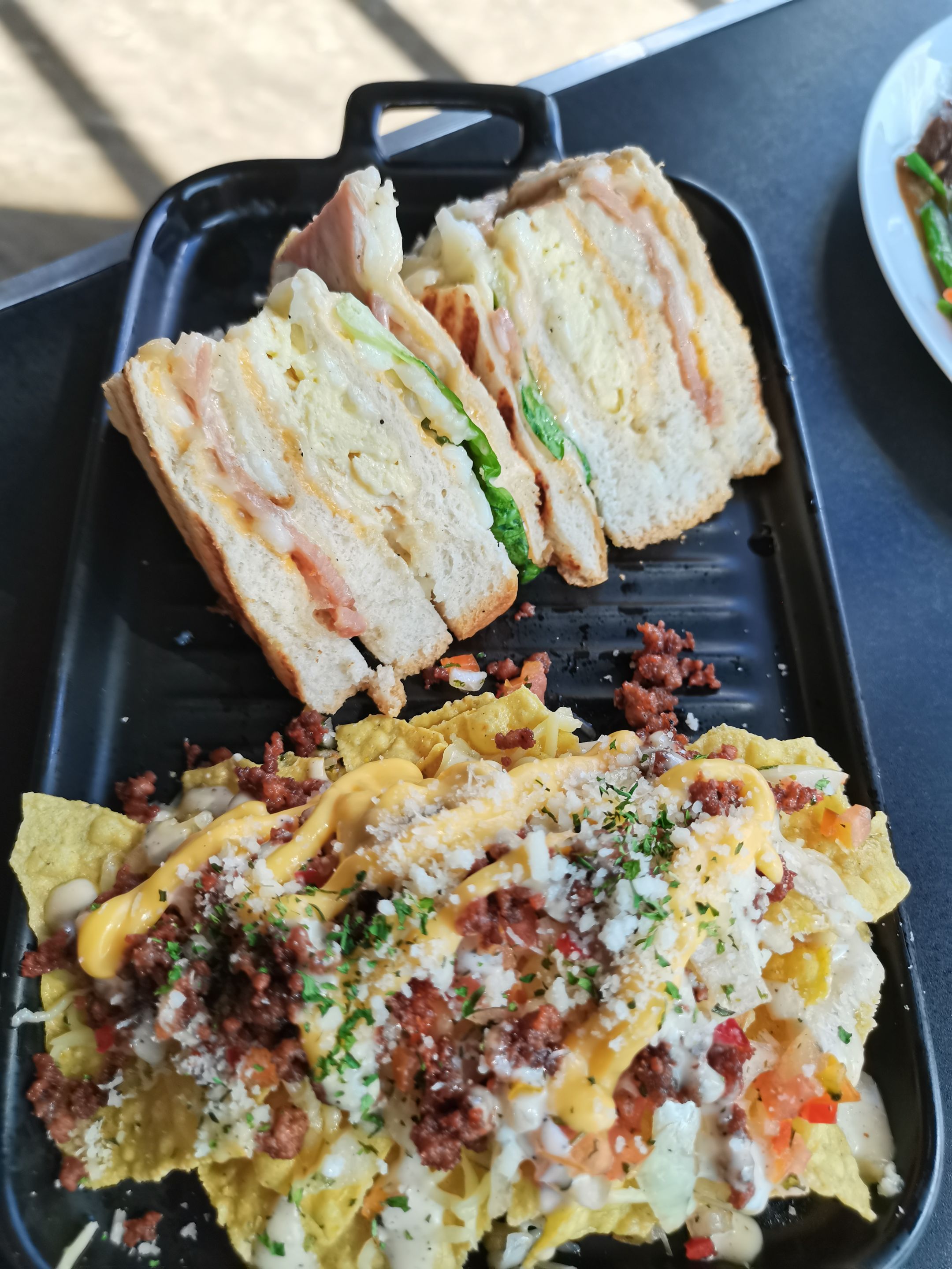 By lunchtime, we settled by the glass windows overlooking Laguna de Bay. My husband had the beef salpicao with rice — tender beef cubes sautéed in garlic, served with vegetables on the side. I had the clubhouse sandwich, stacked with ham, cheese, egg, and lettuce, and it came with a plate of nachos loaded with cheese and toppings.