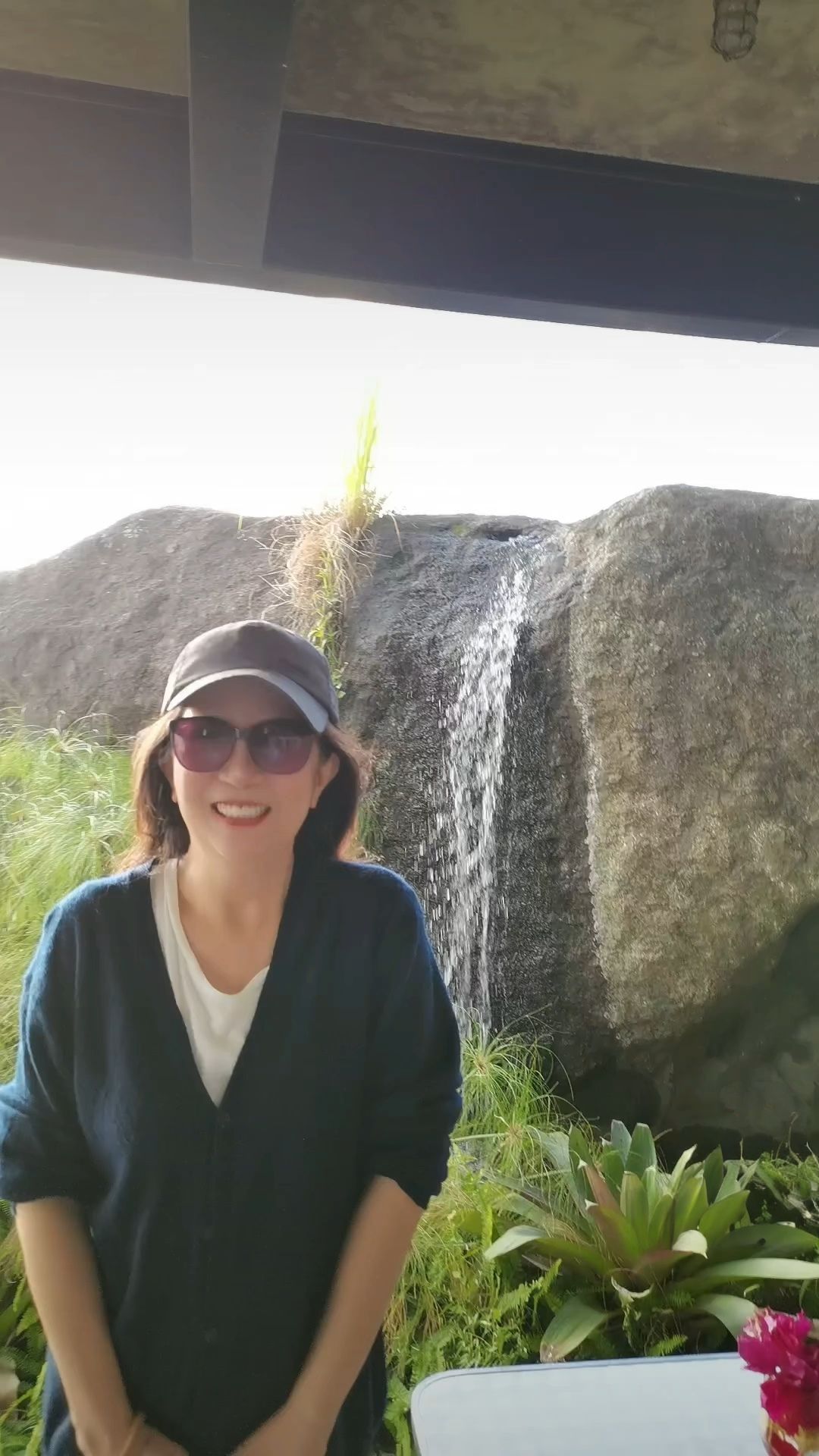 After eating, we went out to the lanai. It was so peaceful out there, with this big rock and all these plants making it feel like a little garden. You could hear the water from the mini waterfall too, which was really nice.