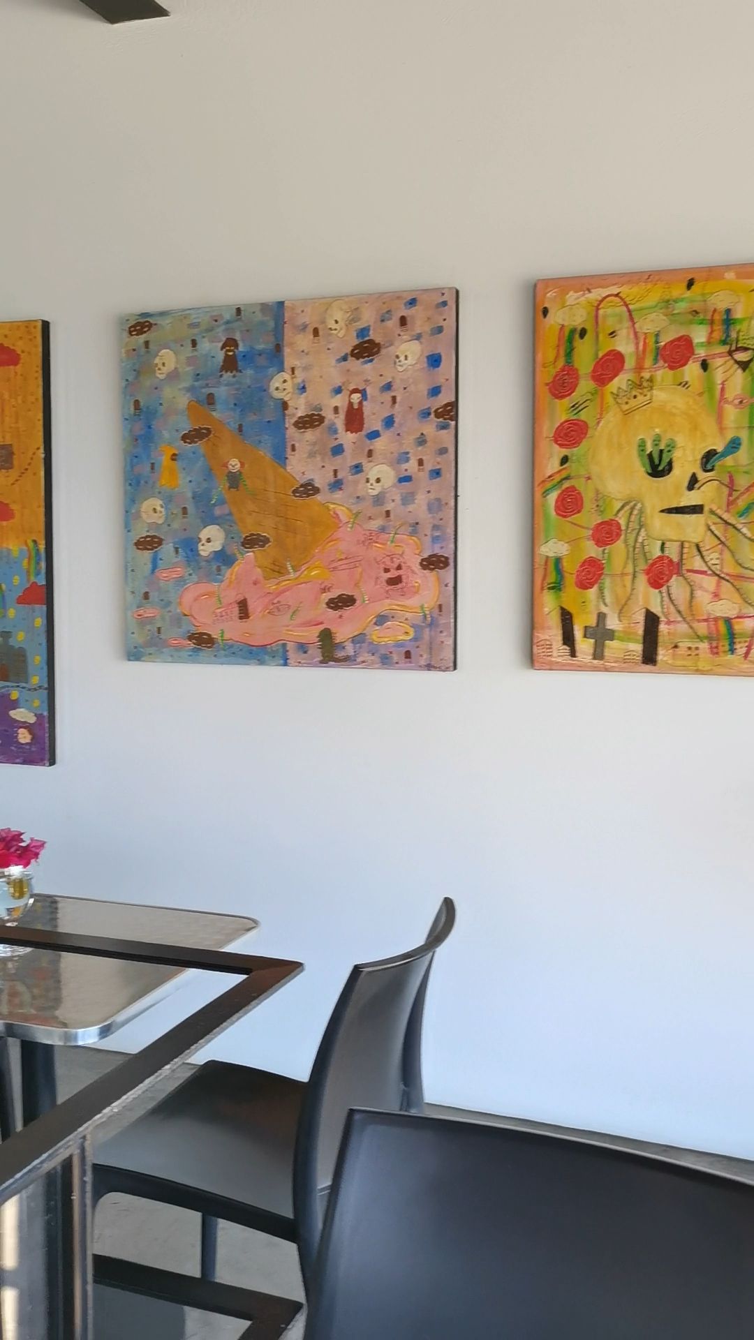 Inside, it was totally full of art. Some paintings were bold and abstract, while others were colorful and playful. They even had art by the stairways, so you’d spot something as you walked up. Every turn had something to look at. It felt like we were dining in a gallery, and every painting had a story to it.