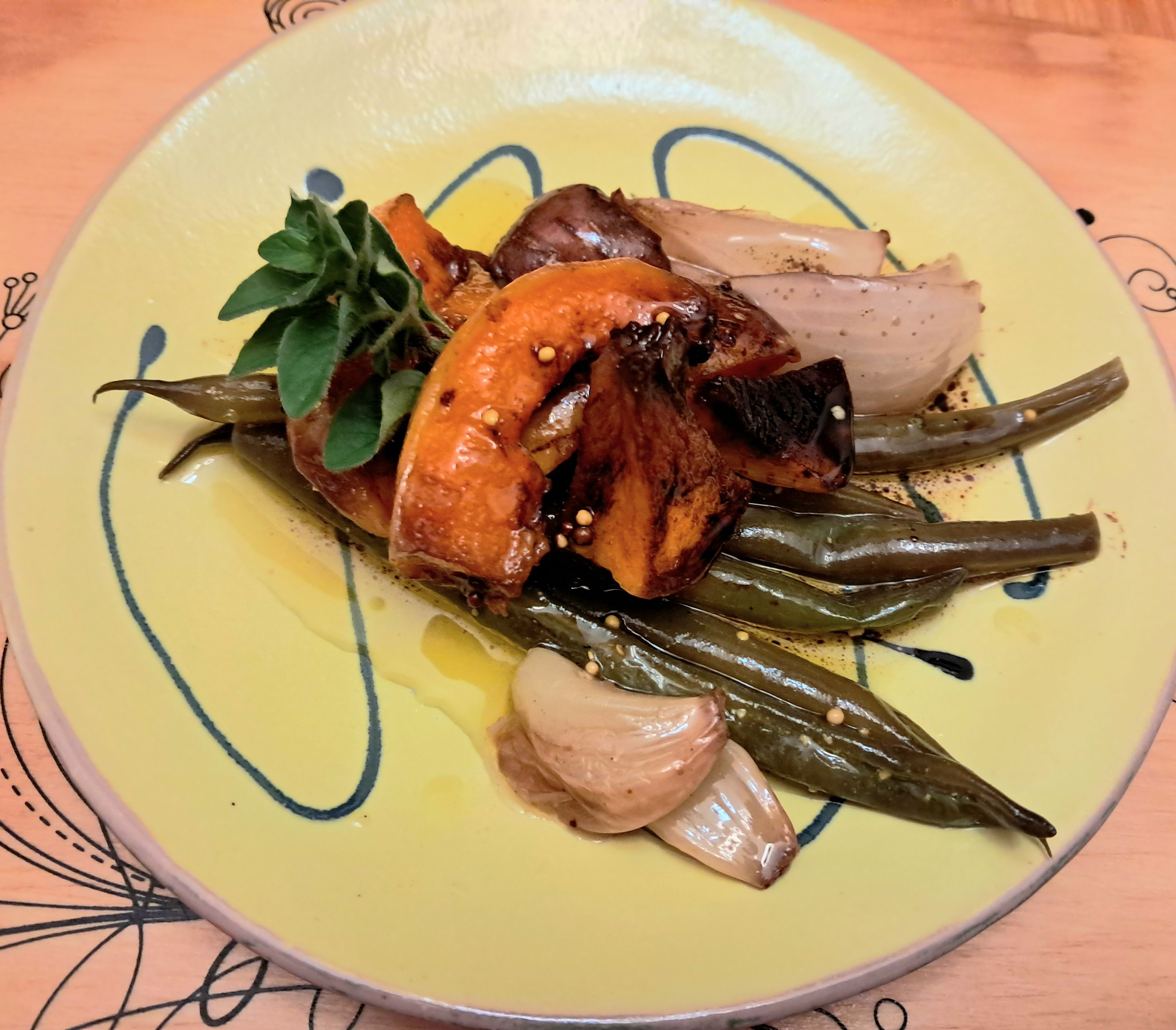 The side dish was roasted vegetables on green beans on a gorgeous Trish O'Keefe plate.