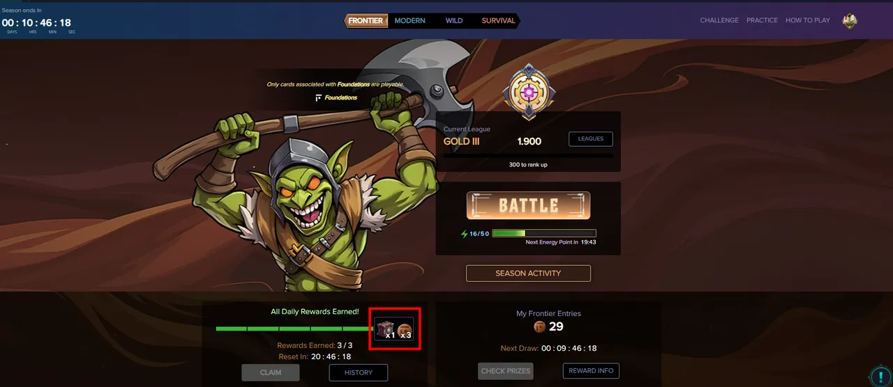 Complete mis tres recompensas del formato Frontier del día, reclamando 3 packs Foundation y acumulando 29 entradas para el sorteo, ojalá tenga algo de suerte esta vez.