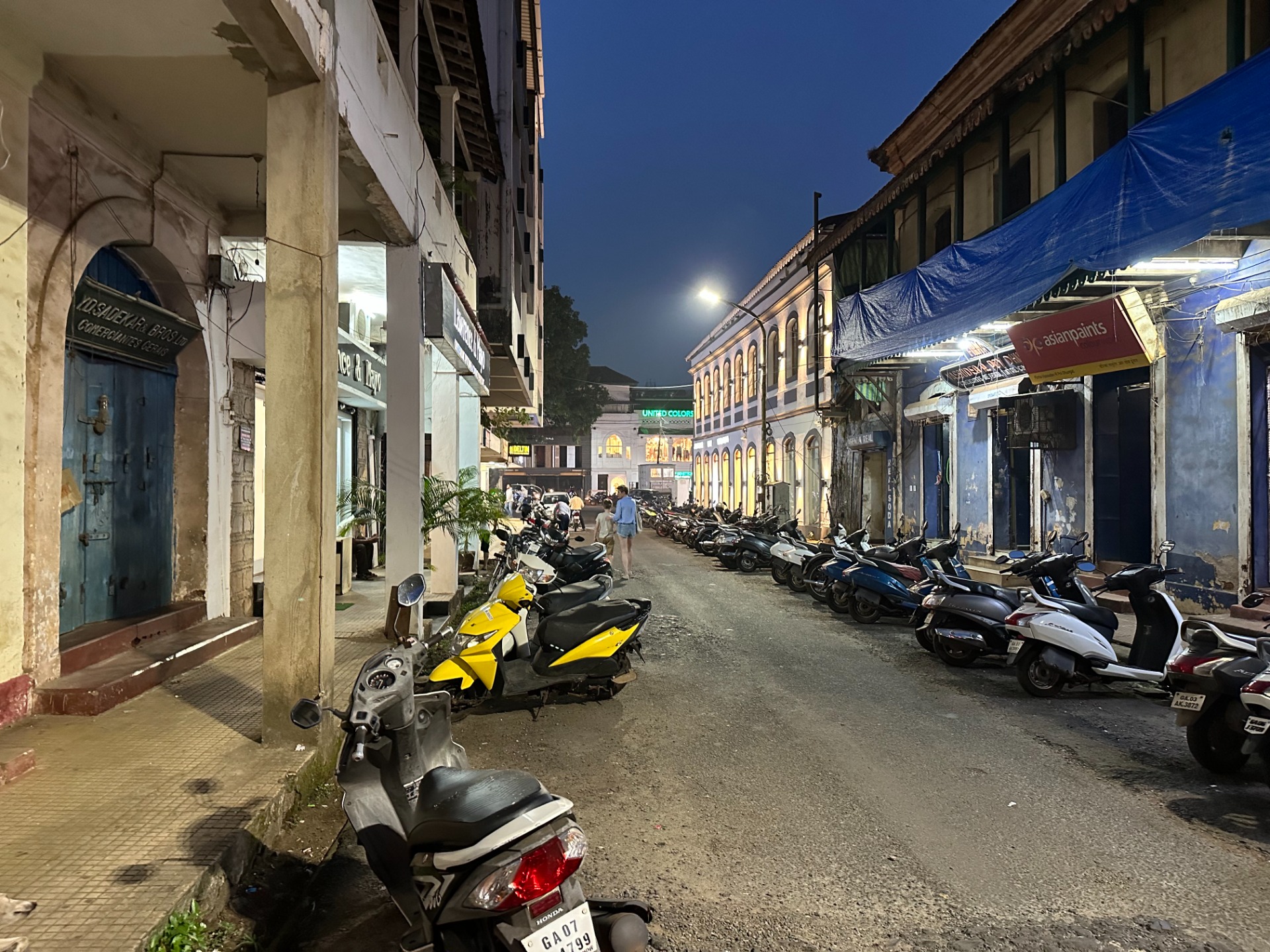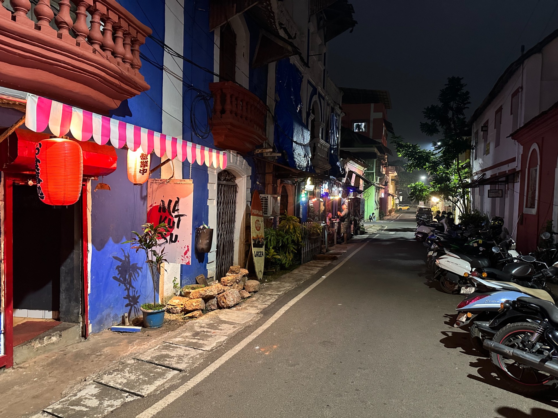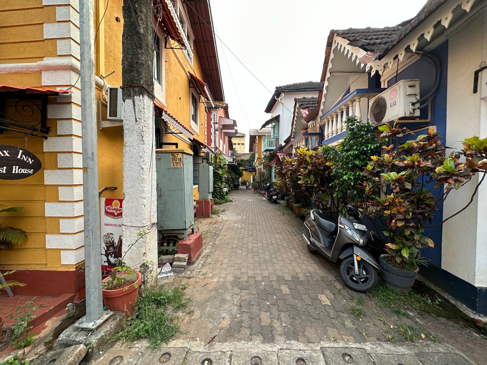 Then there are the streets — narrow, full of scooters and laughter, lined with faded blue and yellow buildings. Each turn feels alive, with old shops, hanging plants, and that unmistakable Goan rhythm that’s both relaxed and full of energy.
