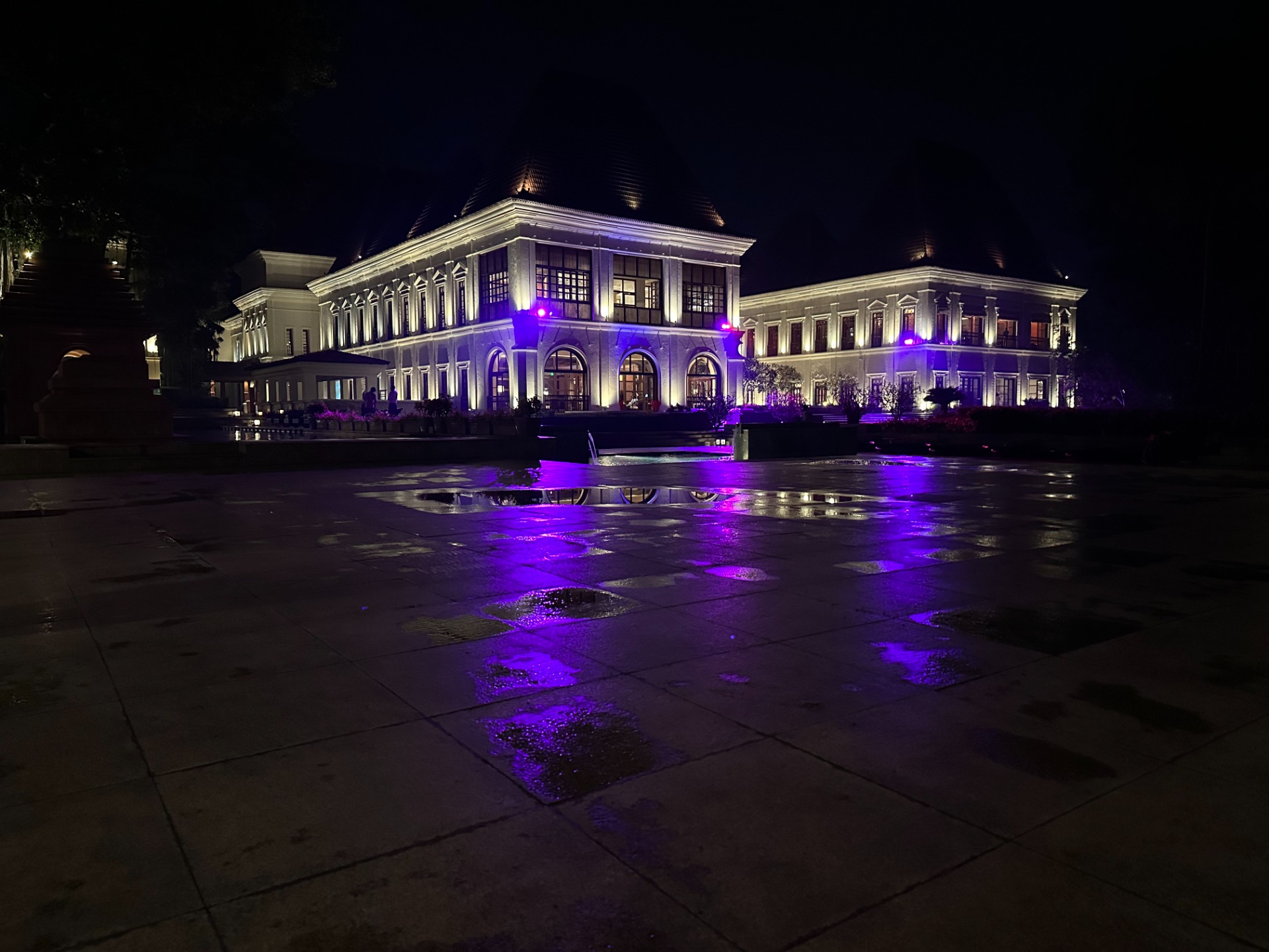 At night, the mood shifts. Buildings glow in soft purple and gold lights, and reflections shimmer on wet stone paths. The air gets cooler, the sounds softer. It’s a different kind of beautiful — elegant and almost cinematic.