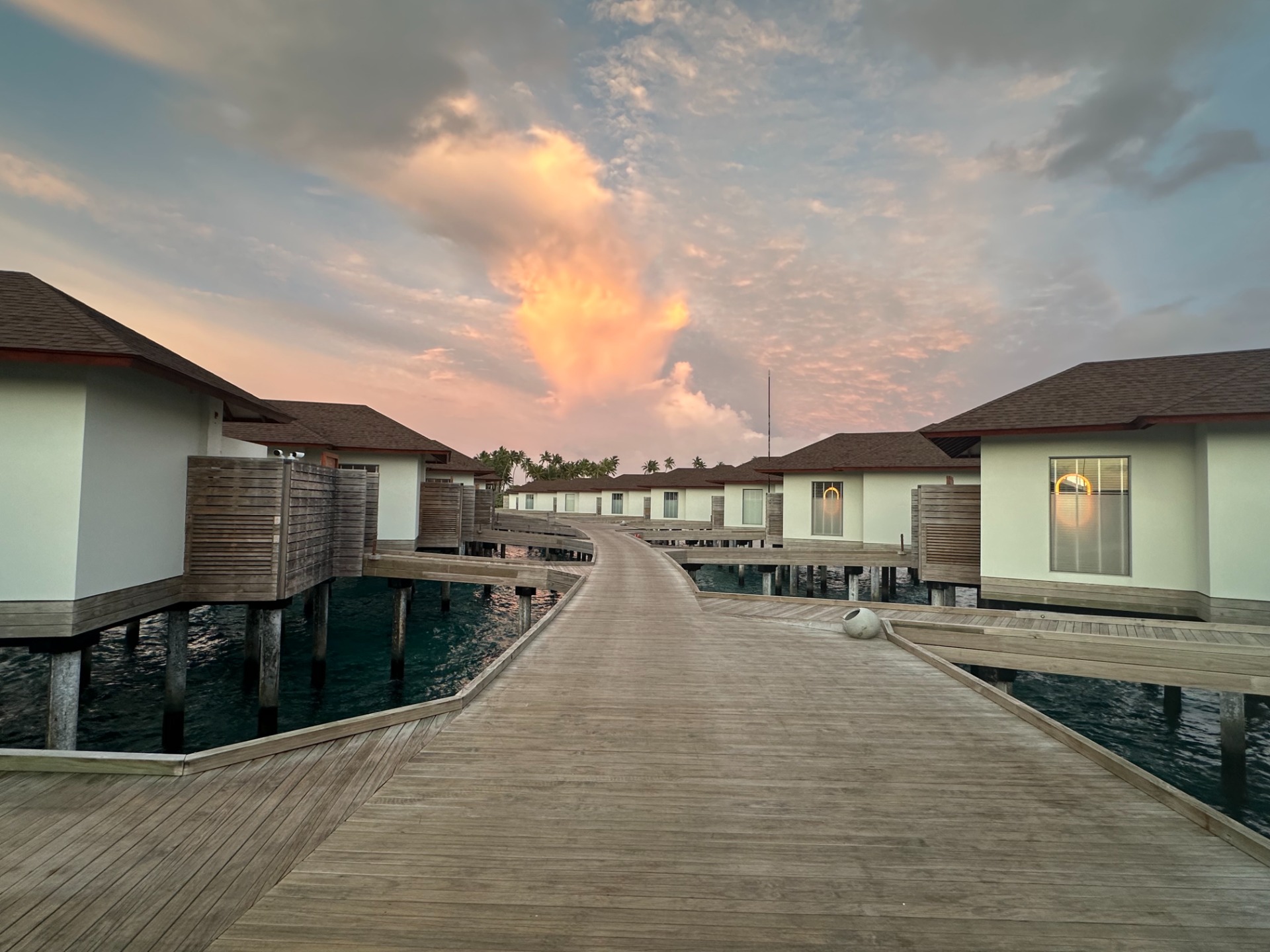 My villa opened right onto the water. Every morning I’d slide open the glass doors to a soft ocean breeze and watch tiny fish dart around the reef below. The room itself felt modern yet relaxed — lots of natural wood, open space, and simple touches that made it easy to unwind. Evenings were for sunsets on the deck, sometimes with a glass of something cold, sometimes just silence.