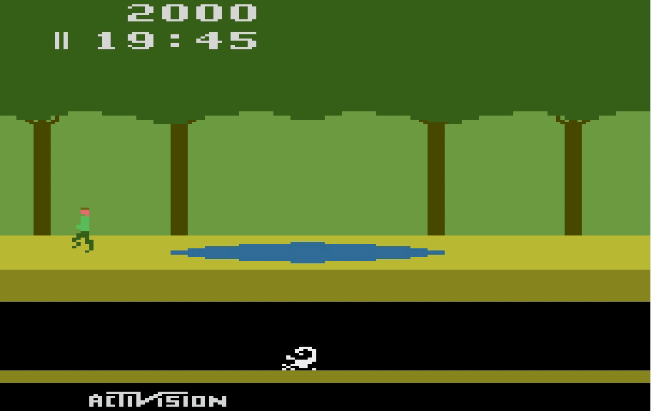 Cabe destacar que este videojuego tiene un protagonista Pitfall Harry, veterano explorador de la jungla, que es un aventurero similar a “Indiana Jones” que debe salir de un bosque muy peligroso y debe esquivar serpientes, saltando cocodrilos y troncos que amenazan con aplastarlo o hacerle daño.
