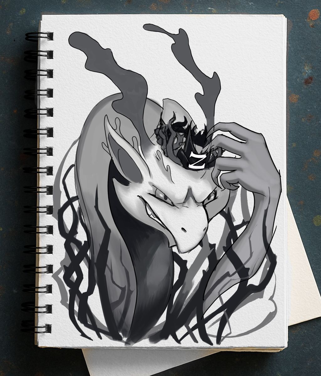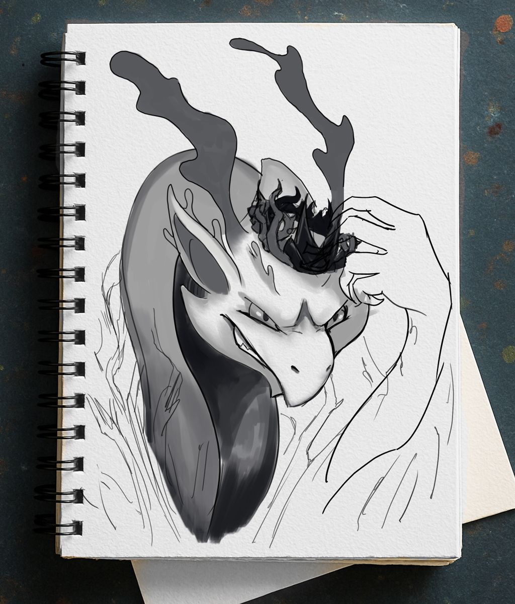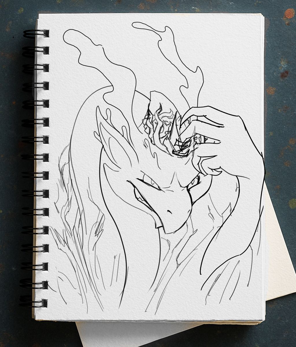 However, I donāt like disjointed-looking drawingsāI prefer everything to feel cohesive. So, when defining the lines, I decided to use a technique common in tattoo designs: adding elements that tie everything together. I incorporated these spiky, branch-like shapes that fit well with the dragonās theme and accentuate its aura of malice. Thatās also why the crown has thorns