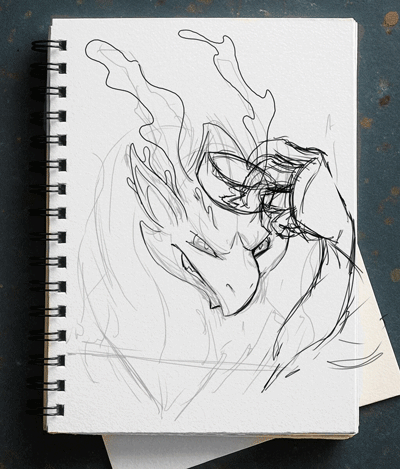 I took a photo of myself to use as a reference for that "bad guy" pose, though I had to adapt the pose because I didnāt want to make Verdarox anthropomorphic. That meant I couldnāt draw the shoulders or chest, so I extended the neck and made the arm appear as if it were floating.