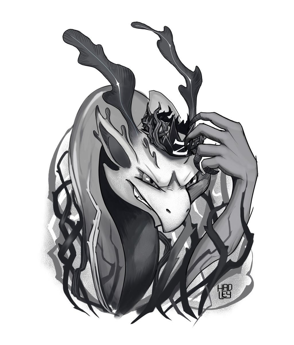 I work in reverseāthe usual method is to have all the line art fully done first, then add shadows with grayscale. But I render everything little by little, so my final touches are always about adding more lines that make the result look cooler. And I actually really loved the white line I added to its... horns?