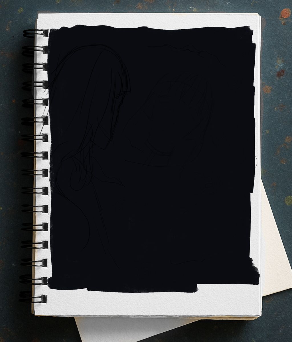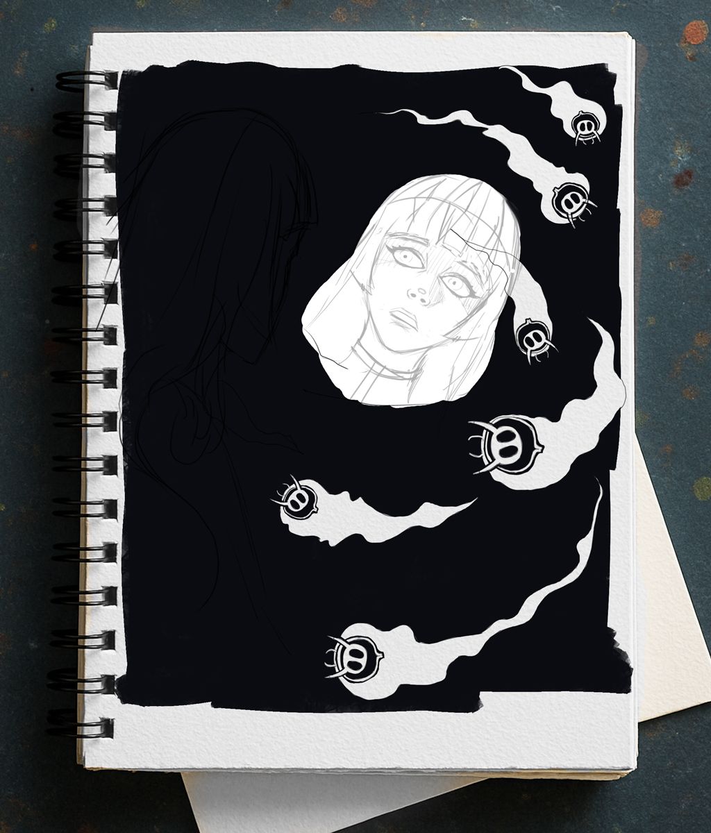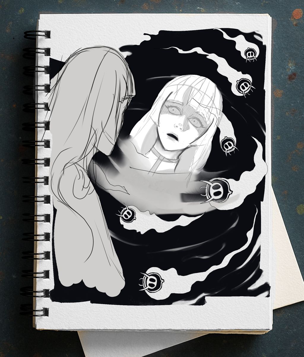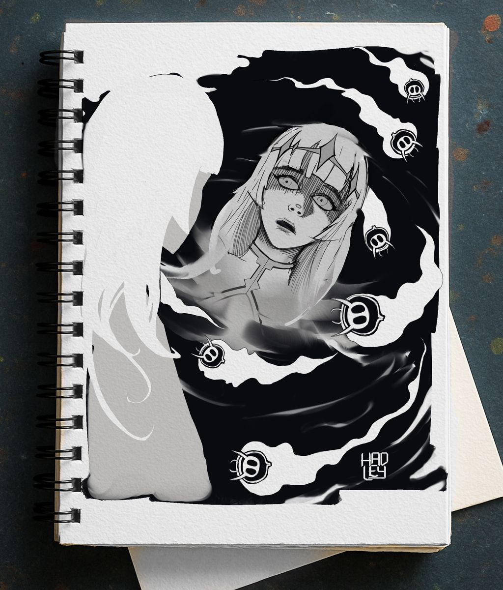 I ended up using the sketch layer of the healer's face—I increased its opacity so the lines would appear deep black, then started erasing and painting over them to refine the result. Something I really loved was how the shading turned out when I added lines over her eyes; it intensified her expression of tension. It's a technique I picked up after years of reading manga. As for the healer's body, my original intention was to render it in detail with clean, polished lineart. But since I left it for last, I felt too lazy to fully commit. Instead, I opted to define her silhouette using a solid color—I just shaped her hair and called it done. It looked great, and it kept the focus entirely on her face reflected in the ink.