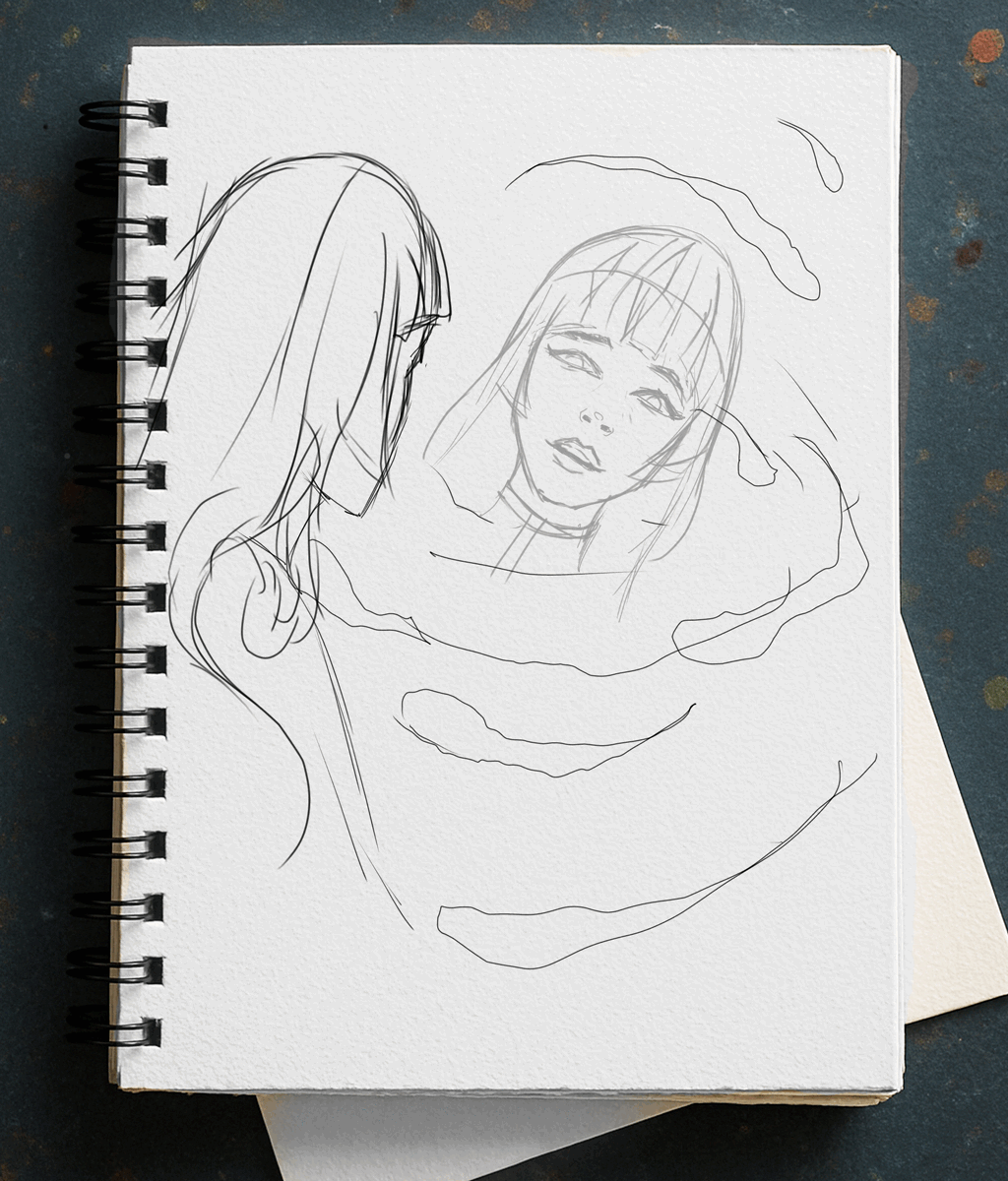 I struggled with how to handle the healer's expression—I wasn't sure whether to make her neutral, more intrigued, or frightened. So, I kept adjusting her expression from one sketch to the next. What I did was duplicate the layer and tweak her expression each time, allowing me to compare and choose which version I liked best. In the end, I went with the most dramatic look and ended up creating a GIF. Almost without planning to, I wound up with a subtle animation of her face shifting between expressions.