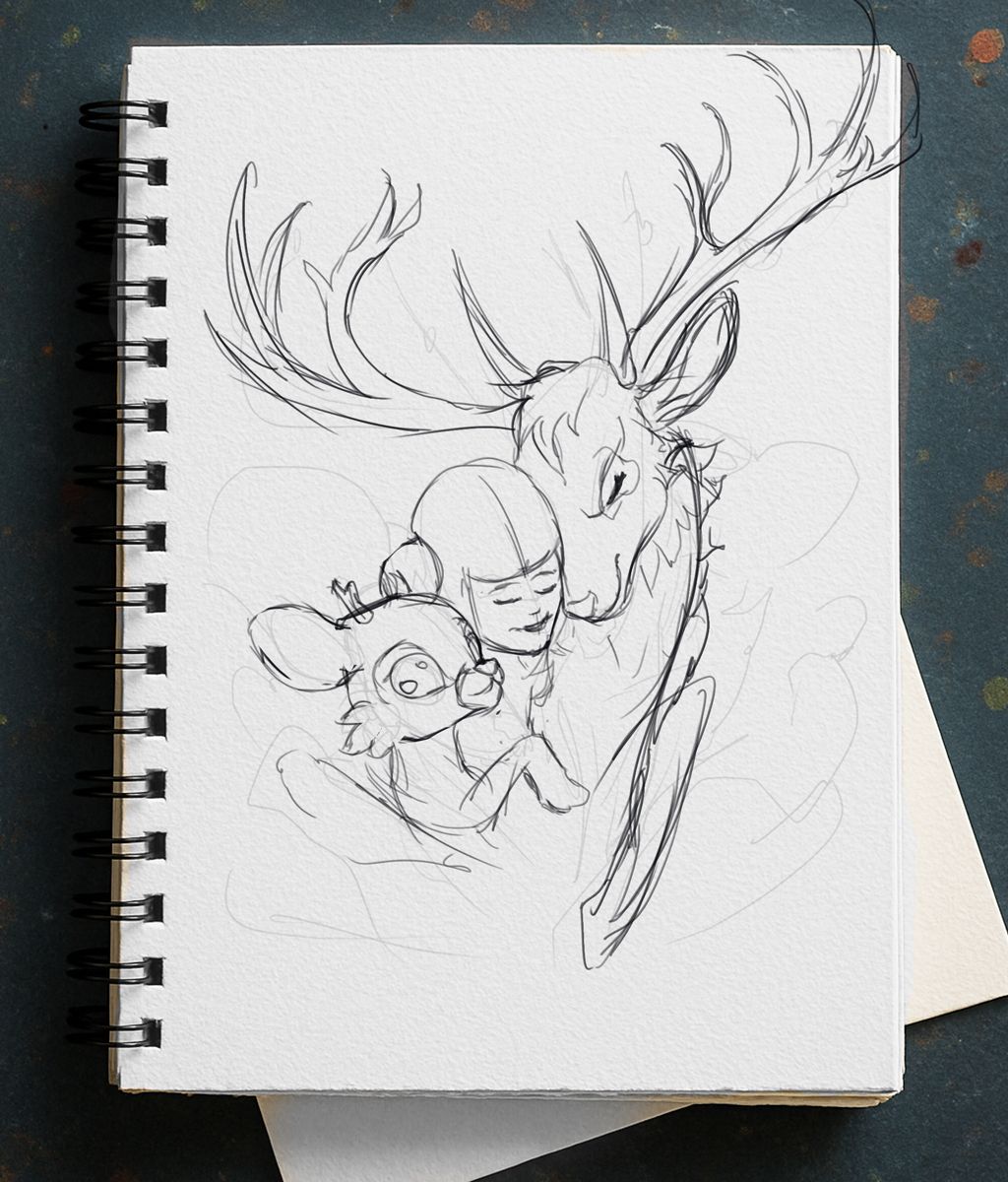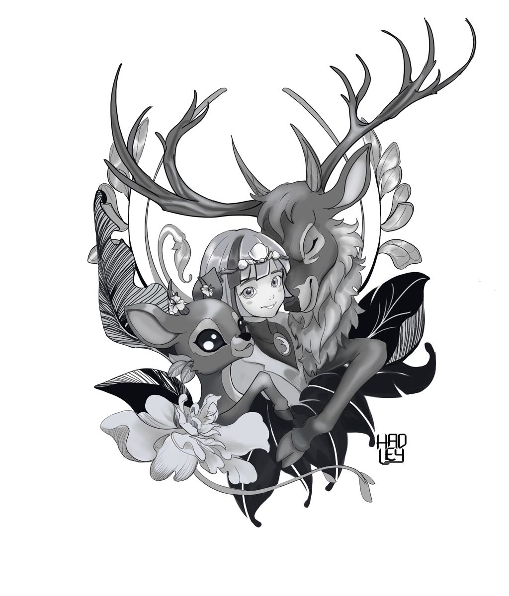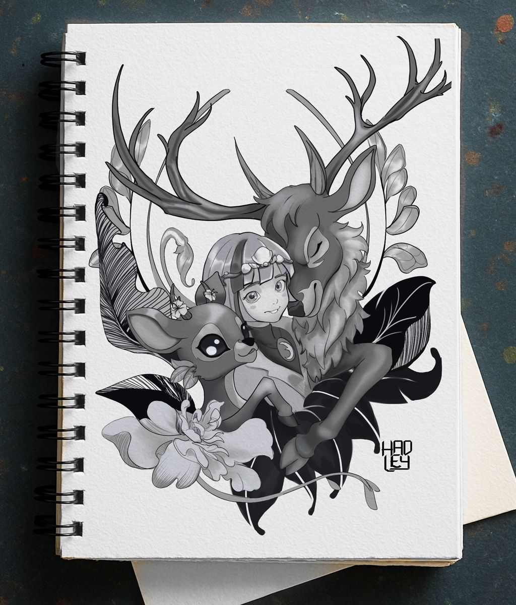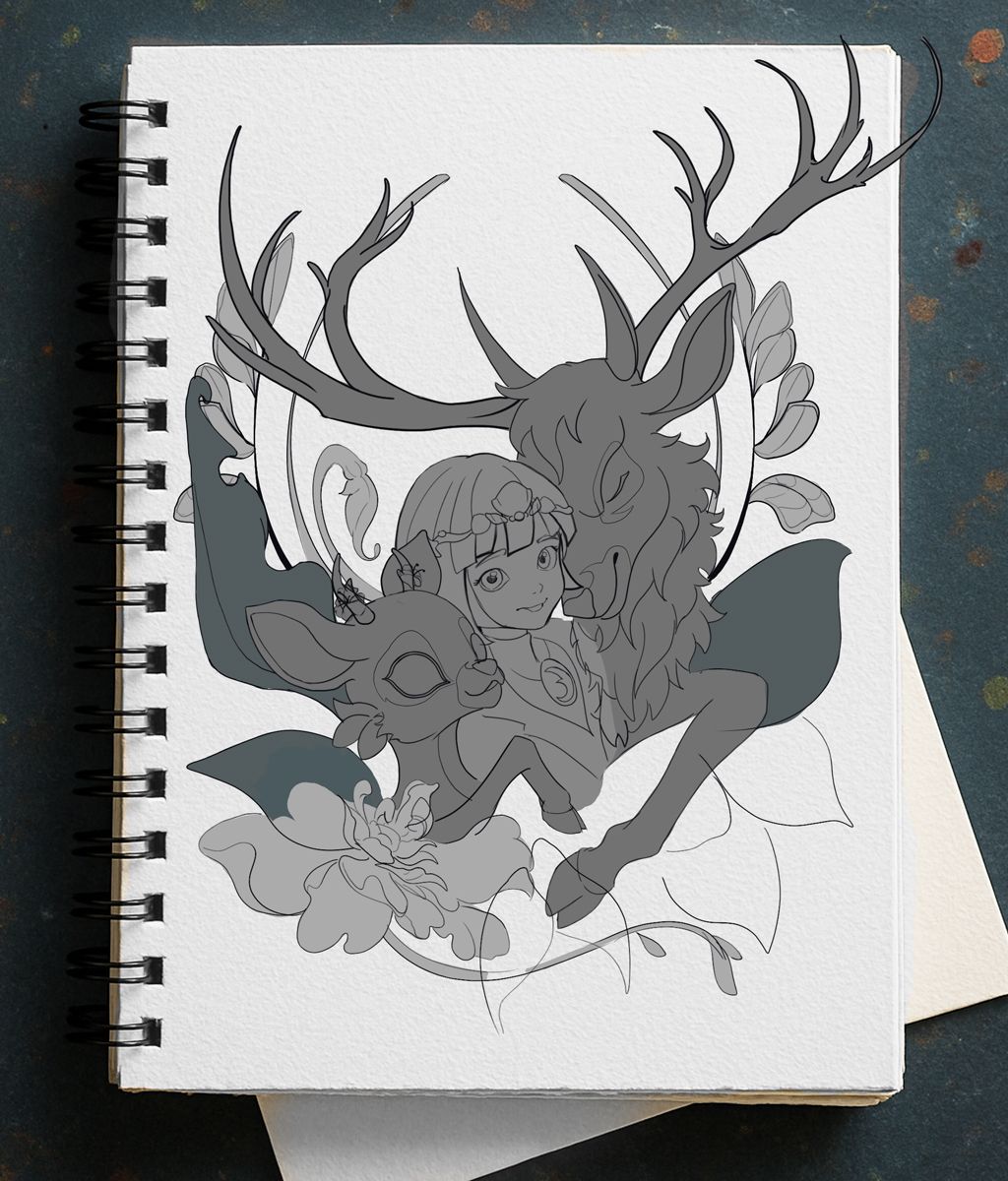 For the fifth prompt, "Deer," I wanted to represent more than just a simple deer: I created Naara and her evolution Shinaaraâtwo majestic creatures almost made of plants, their bodies seemingly woven with living leaves, flowers, and branches. Their connection to nature is deep and symbolic, but to balance the scene and add vibrant contrast, they're accompanied by a small ocean healer, whose presence brings a touch of aquatic light amid all the greenery (even though everything looks gray here)