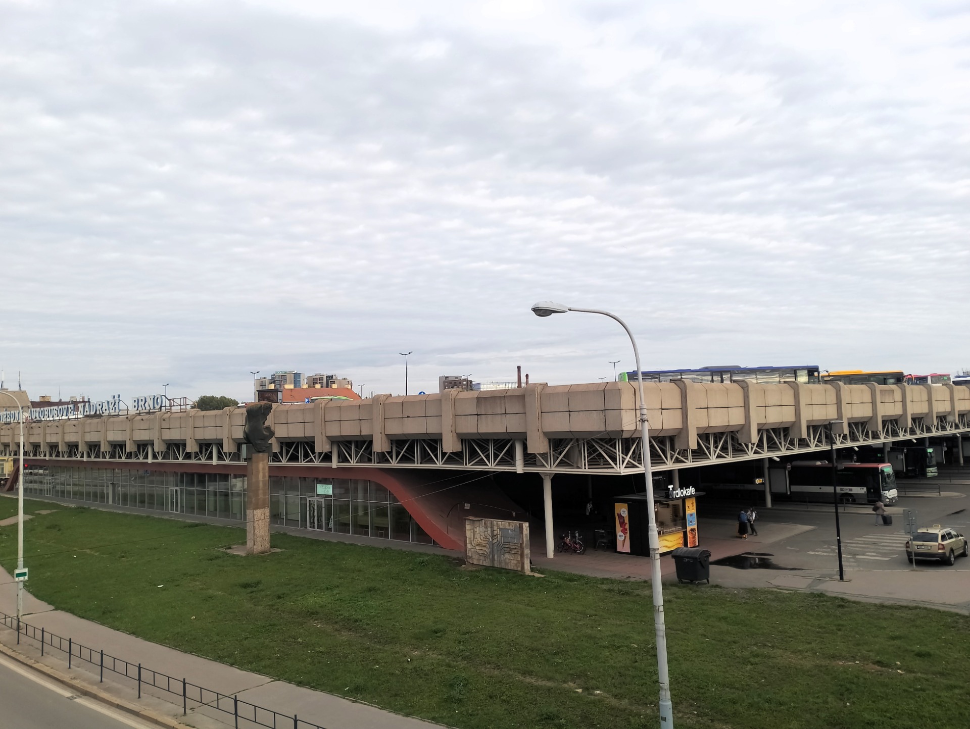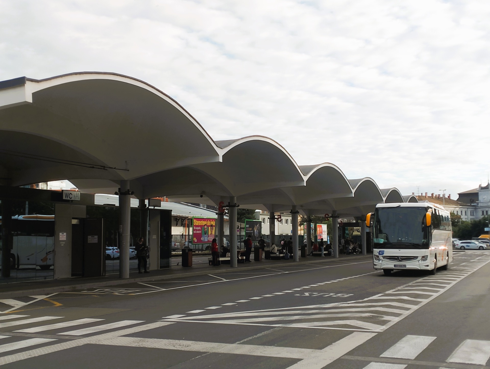 EN: Brno has two main bus stations. Right in the city centre stands a more than century-old functionalist building designed by architect Bohuslav Fuchs. This delicate structure, nicknamed “Grand” after the nearby Art Nouveau hotel, features graceful arches that offer shelter from the rain but provides only ten platforms. From here, coaches of RegioJet and FlixBus depart most often. The station’s weak points are its poor information system, the lack of seating, and a tiny waiting room equipped only with a vending machine for coffee and snacks. By the 1980s, the station’s capacity was no longer sufficient, and so the Central Bus Terminal was built just behind the railway station.