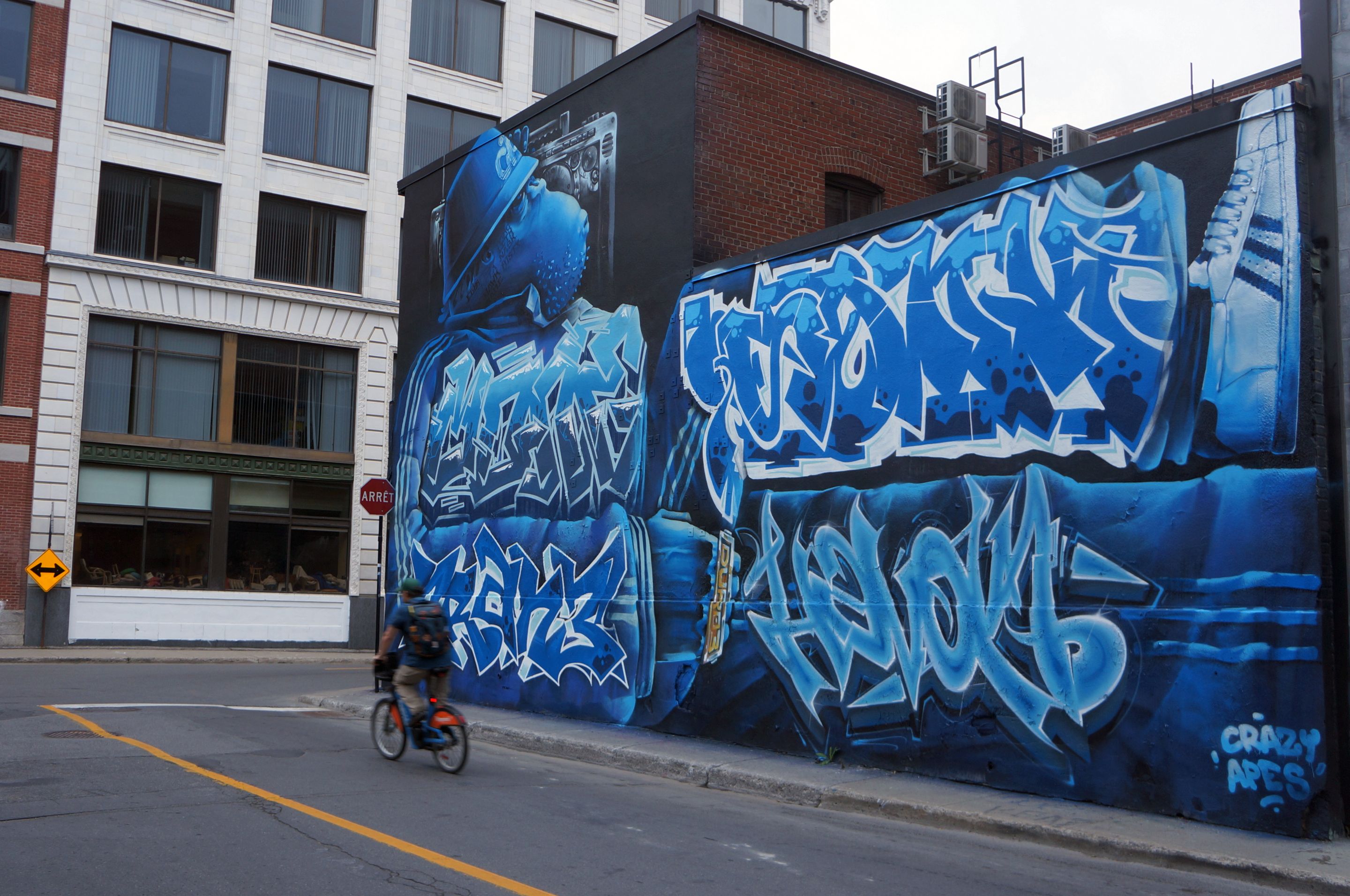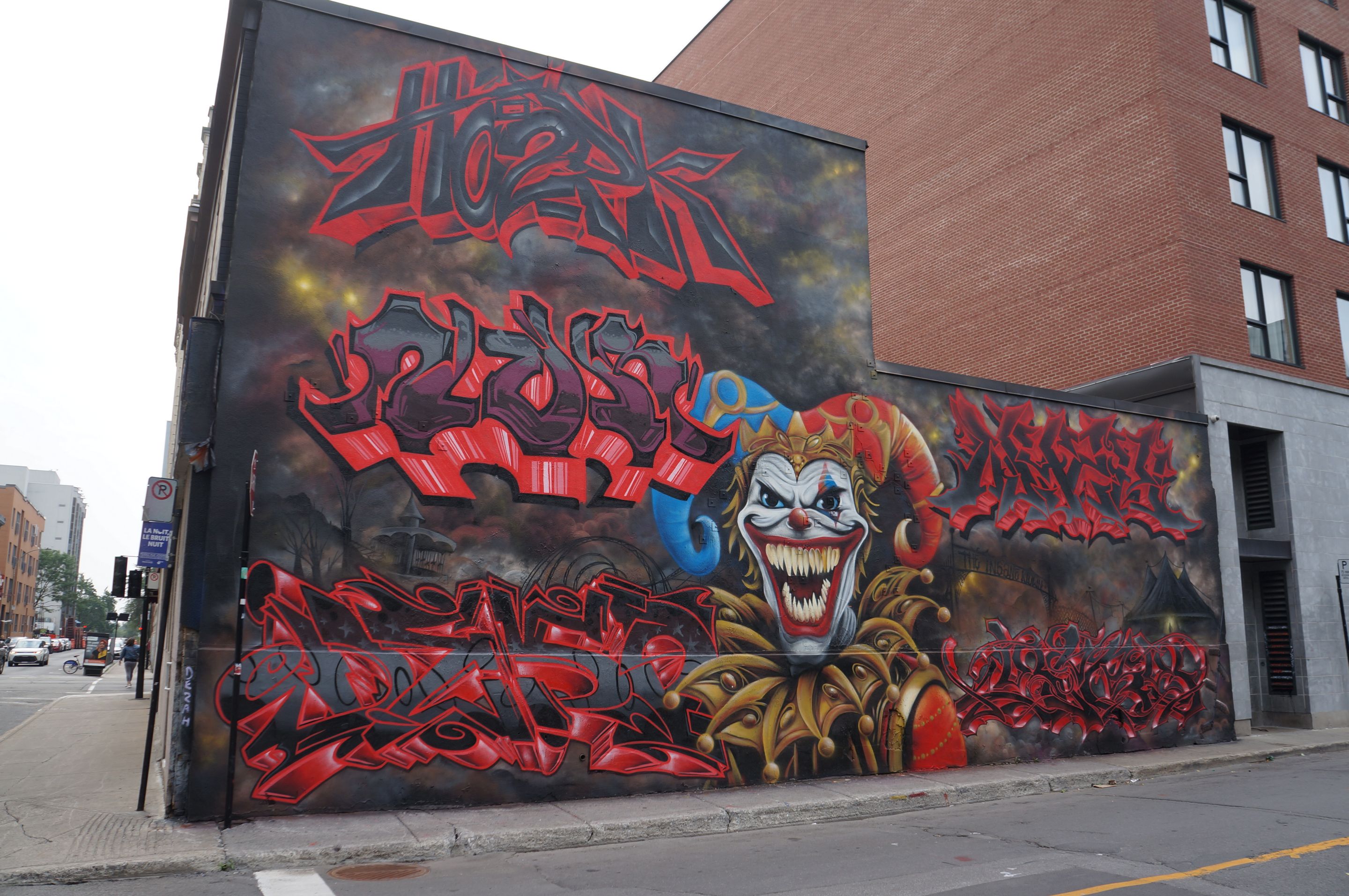 Le festival Under Pressure se déroule sur la rue Sainte Catherine entre le boulevard Saint Laurent et la rue Sanguinet à Montréal. Ce mur, un des principaux, se trouve au coin de la rue de Boisbriand et de l'avenue de l'Hôtel de Ville.