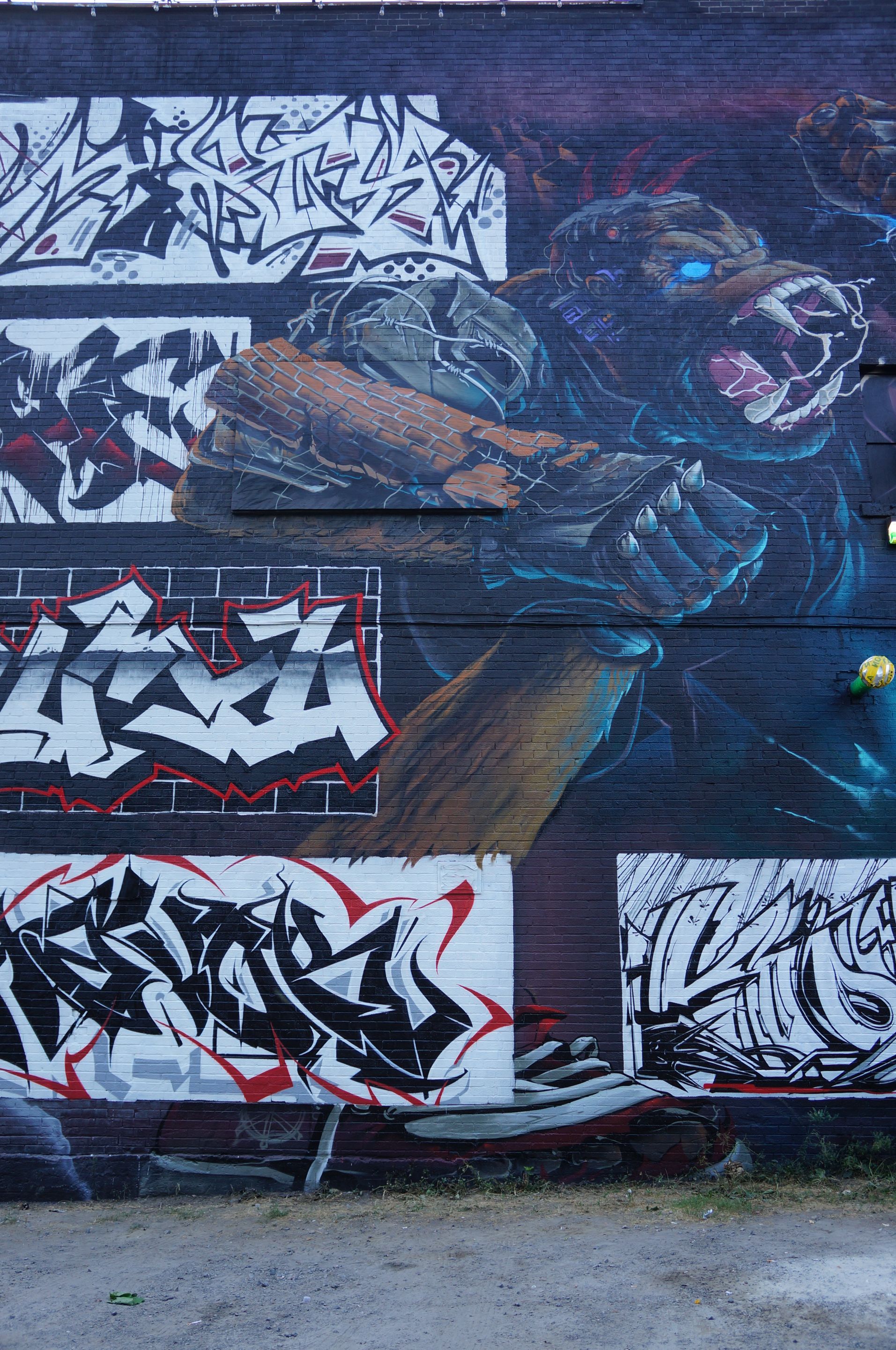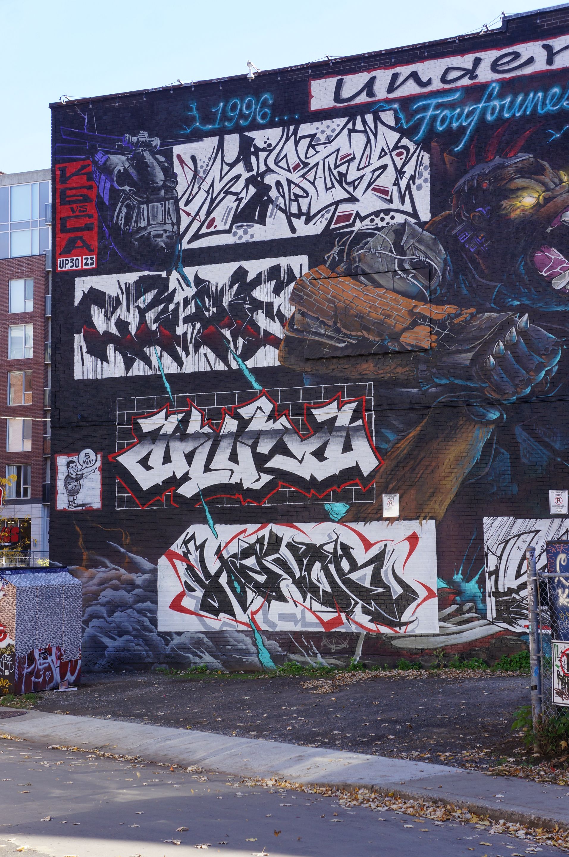 C'est rare que je suis à Montréal lors du weekend où se déroule le festival. Mais un matin j'ai eu un peu de temps pour aller faire un tour dans le quartier. Le mur était déjà bien avancé avec la composition faite et les deux personnages centraux avec cette bataille digne de King Kong vs Godzilla.