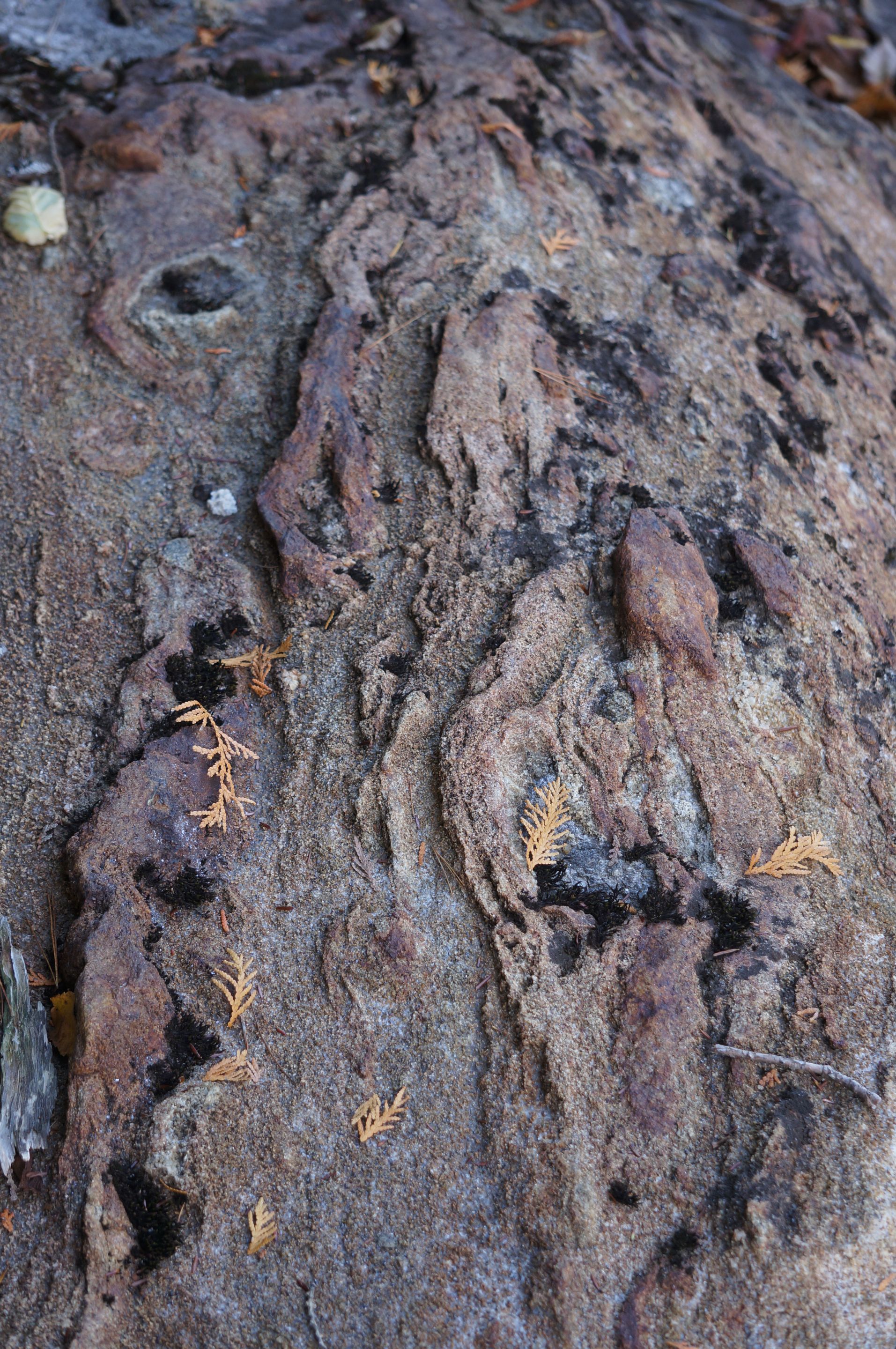 La rivière était bien calme. La pluie a été rare cet été et surtout cet automne. Même le fleuve Saint-Laurent manque d'eau. Mais on peut voir qu'à la fonte des neige, la rivière du Diable peut mieux porter son nom et charrier d'énormes troncs d'arbres. Sur la photo de droite, c'est la pierre où j'étais assis, en me levant, j'ai cru apercevoir un visage d'un borgne. Est-ce que vous le voyez aussi ?**