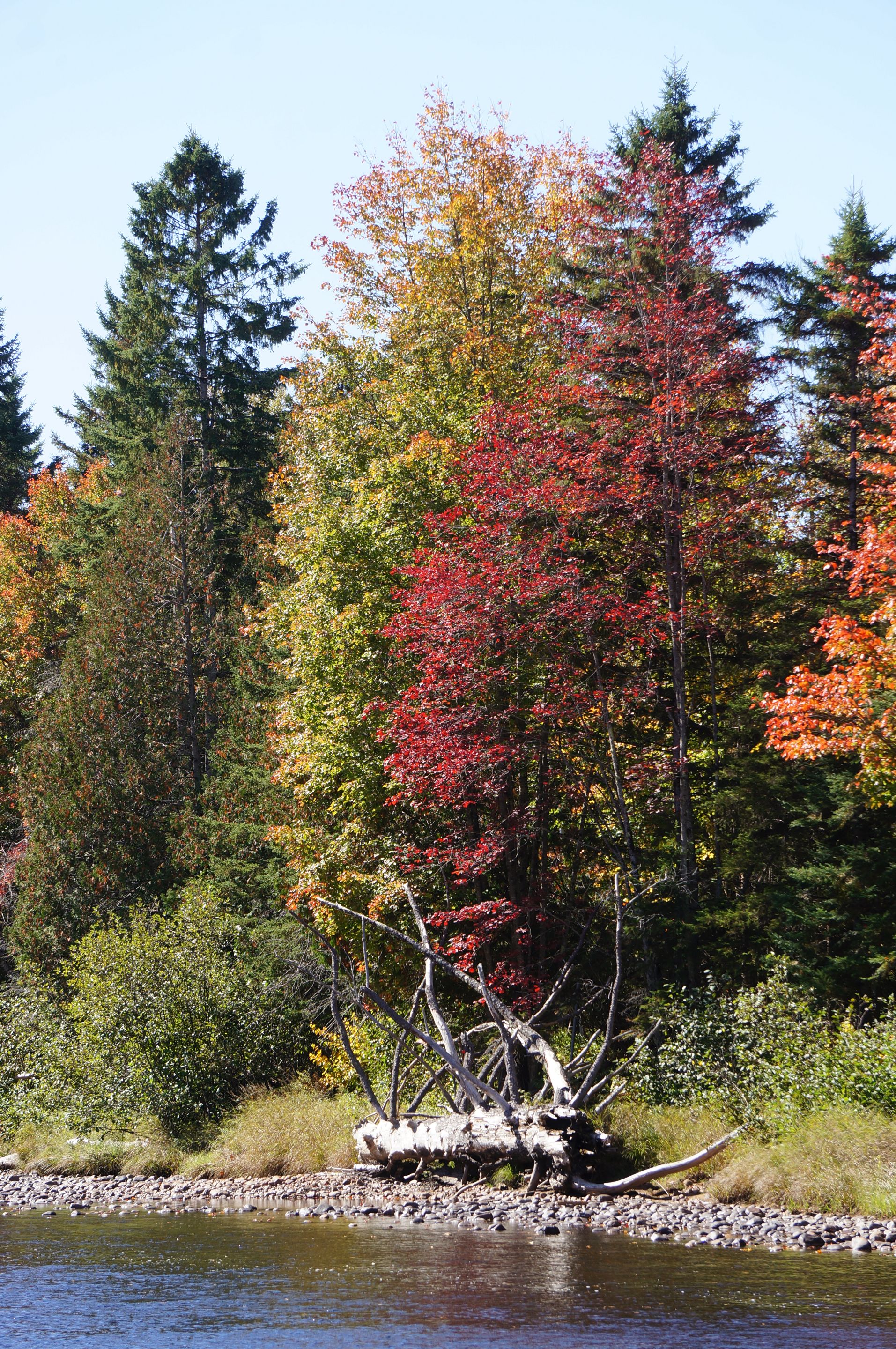 The river was very calm. Rain has been scarce this summer and especially this fall. Even the St. Lawrence River is low on water. But we can see that when the snow melts, the Devil's River lives up to its name and carries huge tree trunks. In the photo on the right, you can see the rock where I was sitting. When I stood up, I thought I saw the face of a one-eyed man. Can you see it too?