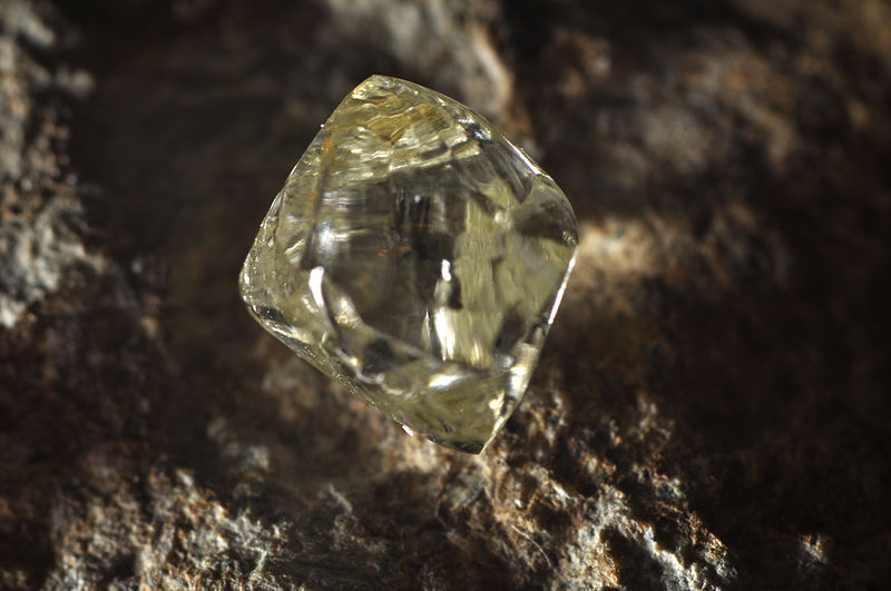 One face of an uncut octahedral diamond, showing trigons (of positive and negative relief) formed by natural chemical etching, User: Gump Stump Licence:CC BY-SA 3.0