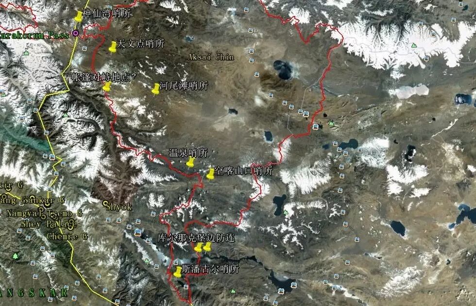 中国五个海拔超过5000米的哨所,都在中印西段边界,为我边防13团所在的天-空防区。他们是:神仙湾、天文点、河尾滩、温泉、空喀山口。其中,河尾滩哨所海拔最高,为5410米,天文点5390前哨为5390米,神仙湾为5380米,天文点5171米,空喀山口为5040米,温泉为季节性哨所。