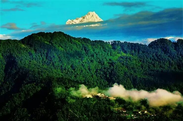 ▲摄影/Jane Sweeney/c 白色村庄占据了富饶的山麓,视线往上移,蓊郁的森林将整个山体包裹,并托举出海拔8586米的雪峰干城章嘉峰。