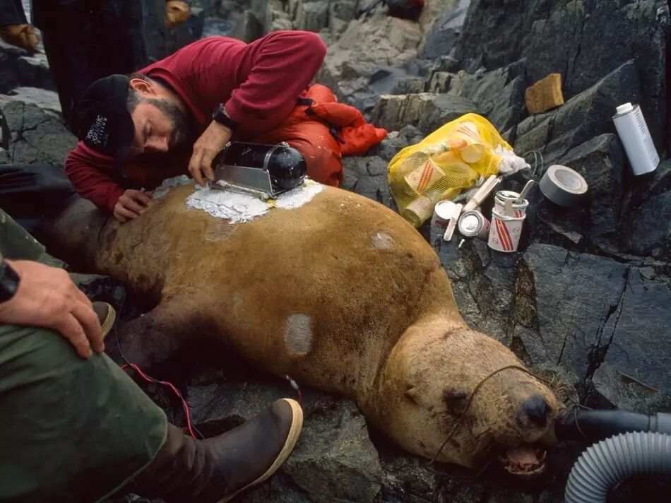 遥感轻型摄像机被放置在鲨鱼,企鹅和狮子身体上,以揭示野生动物的行为。 图片是马歇尔在1991年将遥感摄像机附到一个Steller海狮身上。