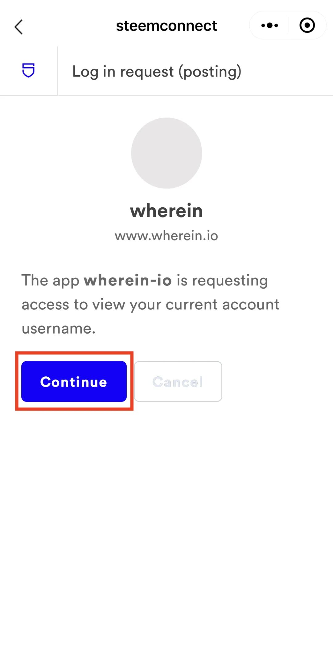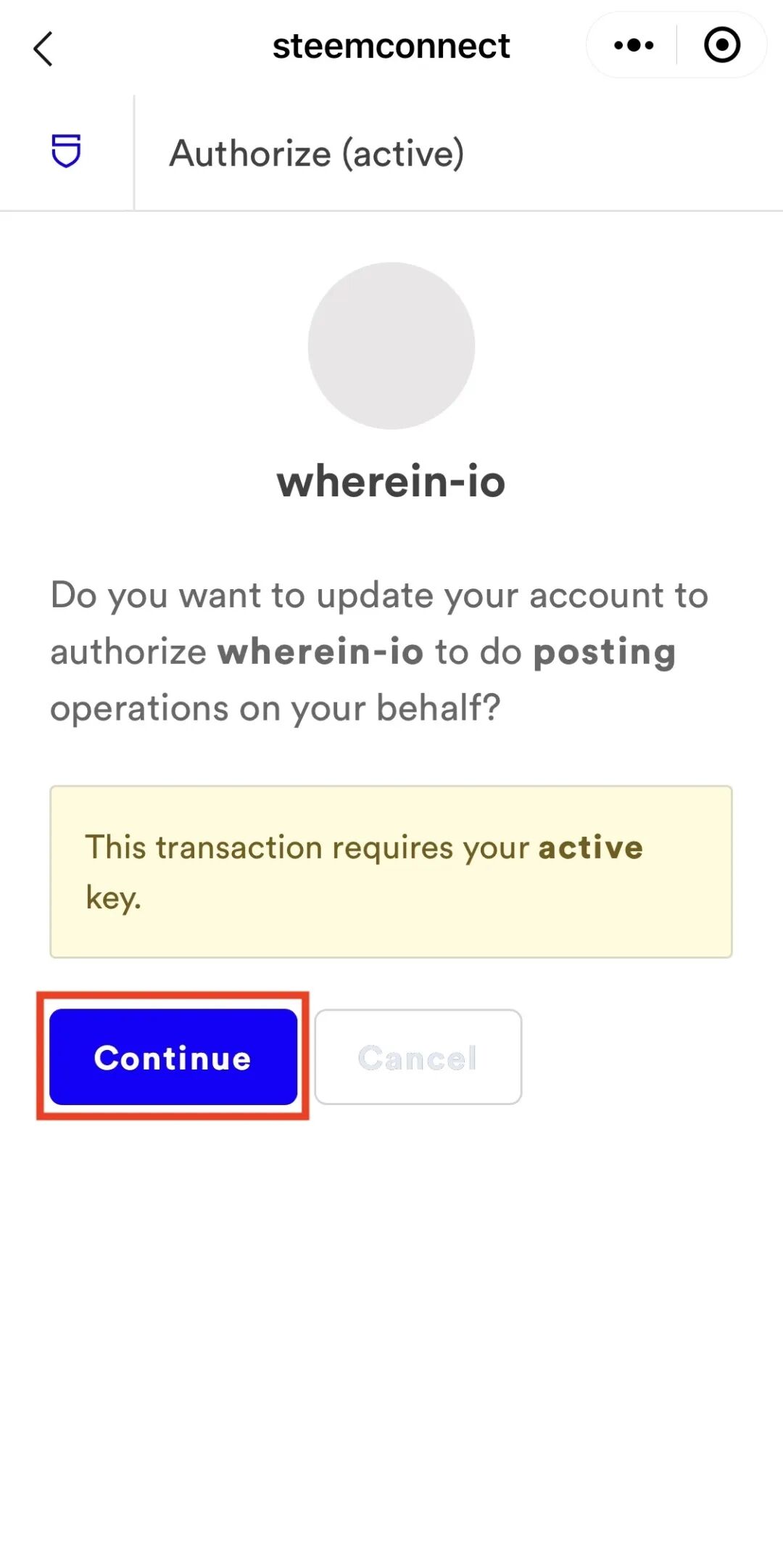 STEP4 提示将该账户的发帖权限授权给wherein-io,轻点「Continue」