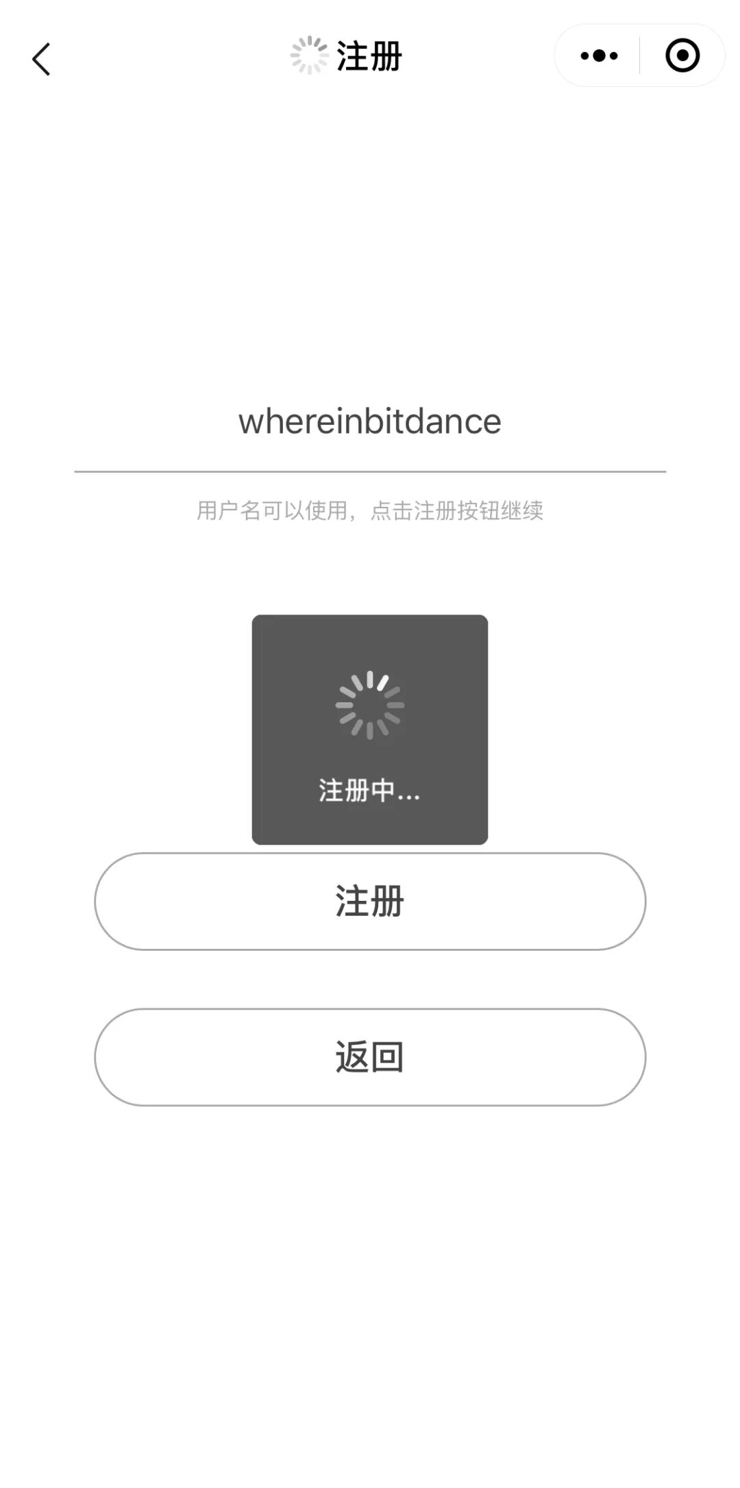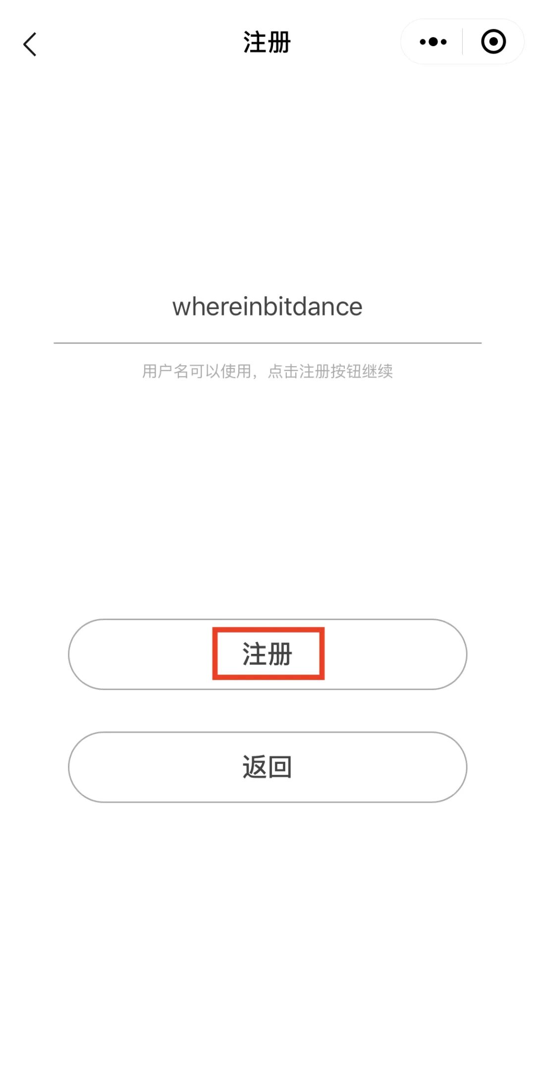STEP2 在注册界面,输入用户名<英文或英文+数字>,轻点「注册」;小程序自动开启注册,并代理 10SP 给到新的Steem账号,注册成功即自动登录,进入「我的」页面
