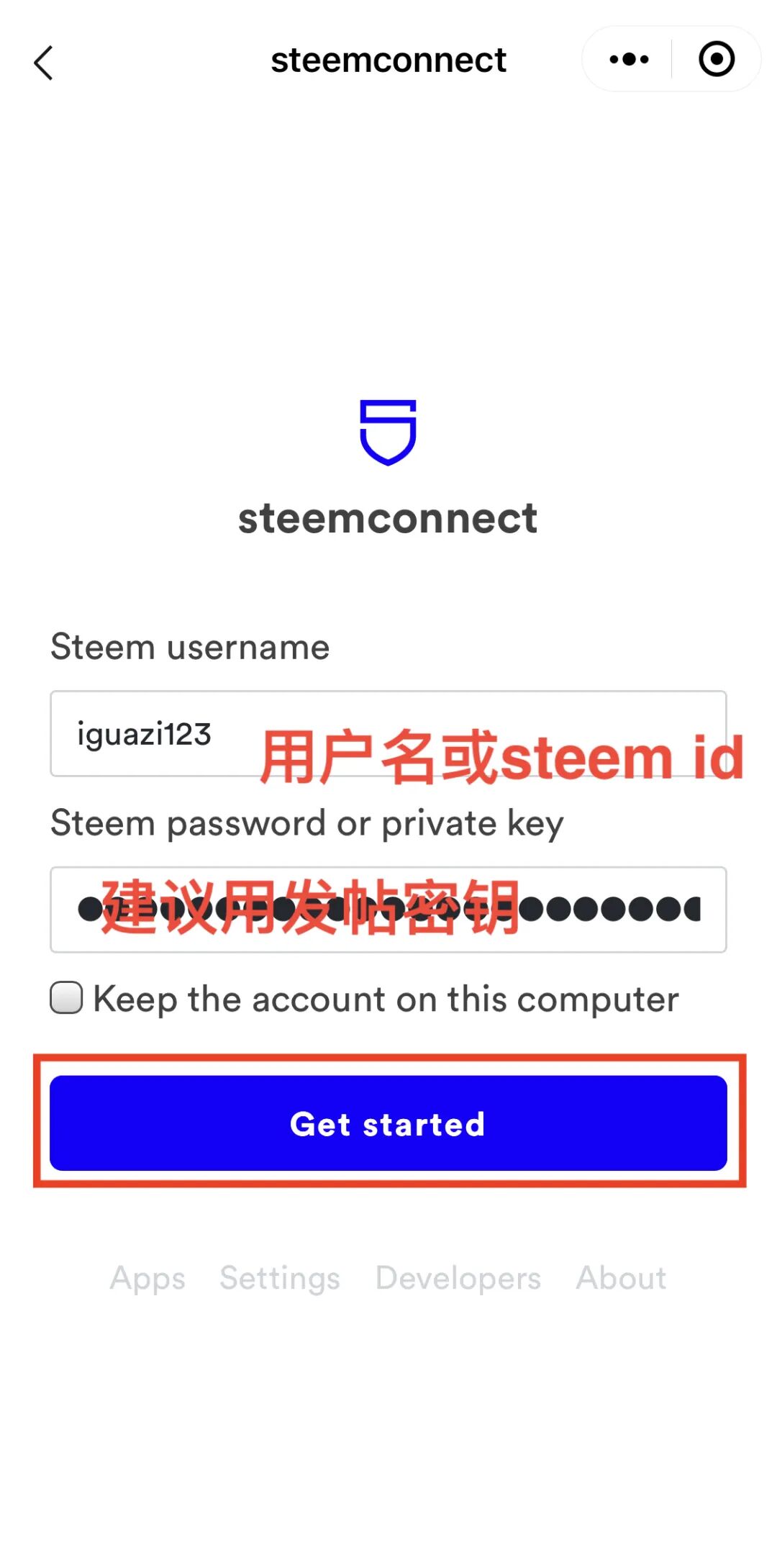 STEP3 进入到登录界面,输入用户名<或steem id>、发帖密钥,轻点「Get started」,注意下面的小框框不要勾选