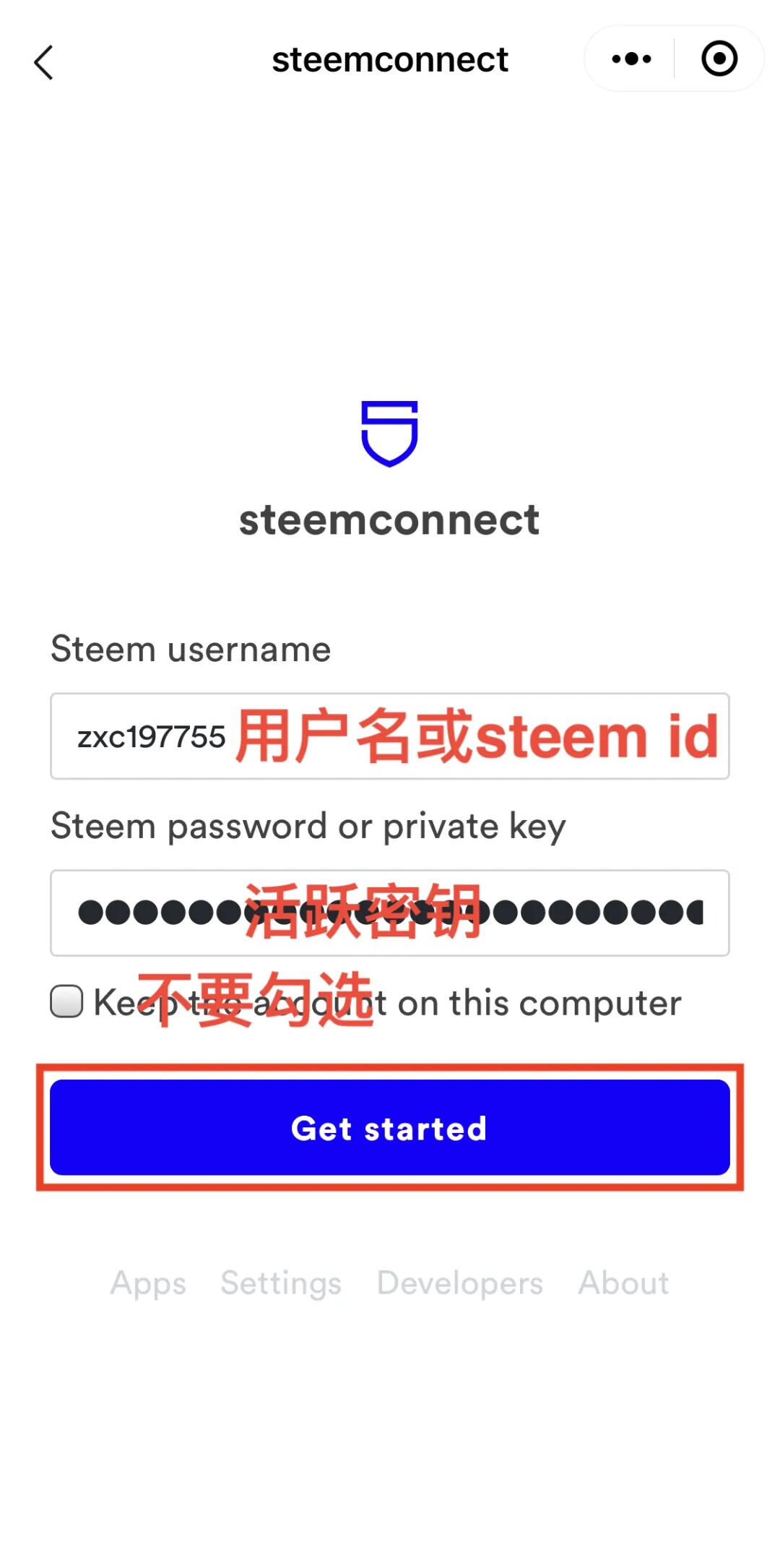 STEP5 进入到授权登录界面,输入用户名<或steem id>、活跃密钥,轻点「Get started」,注意下面的小框框不要勾选