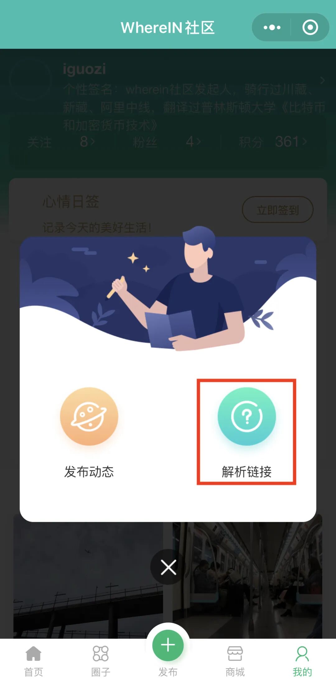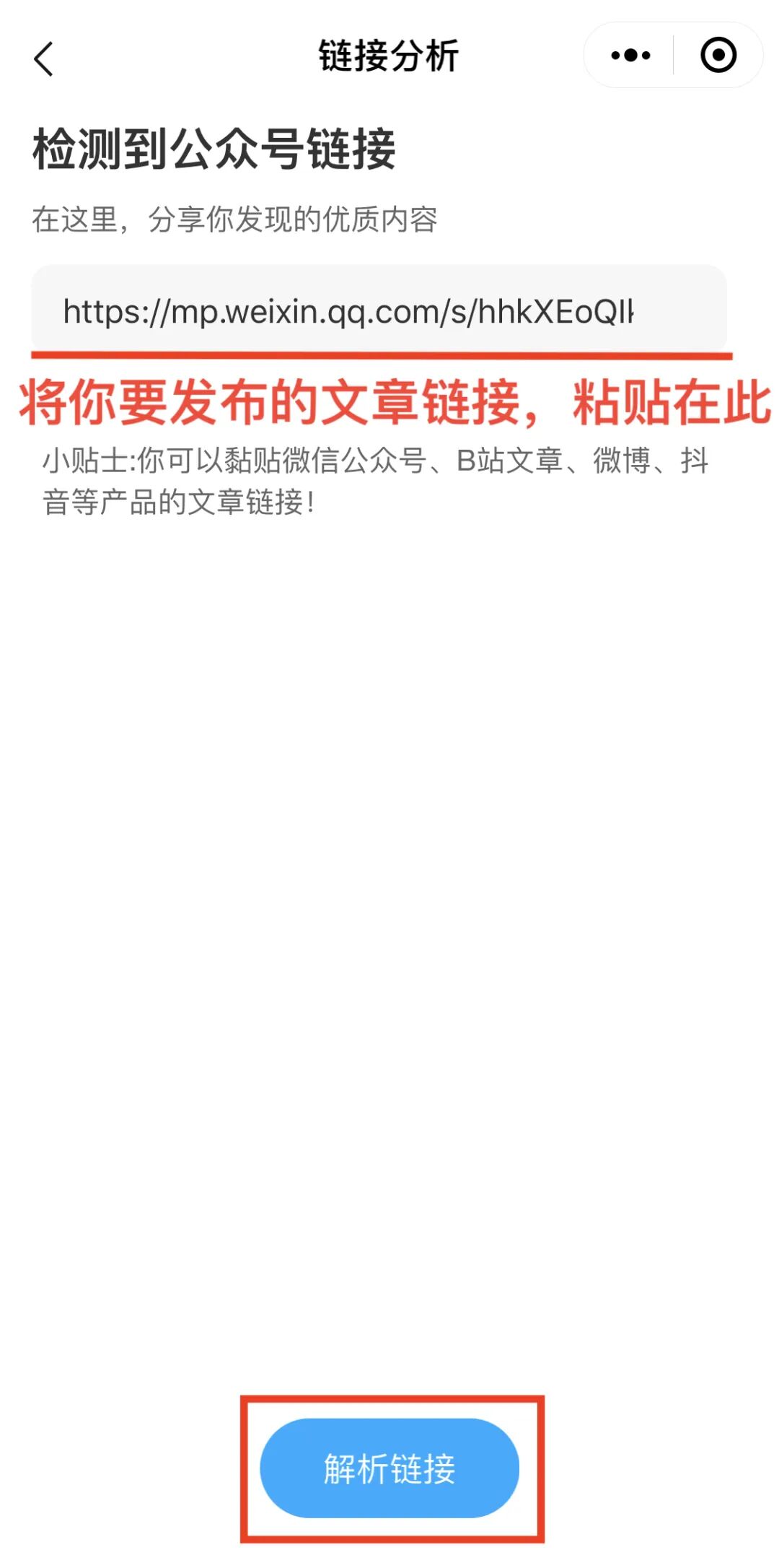 将要发布的文章的链接,粘贴在链接框内,轻点「解析链接」,将进入到链接发布页