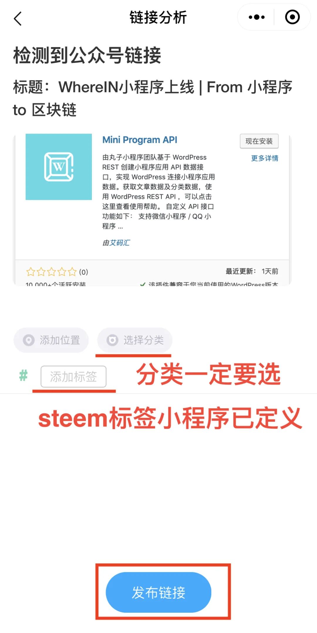 在链接发布页,定义内容链接的分类和其在小程序上的标签,轻点「发布链接」,文章即发布成功