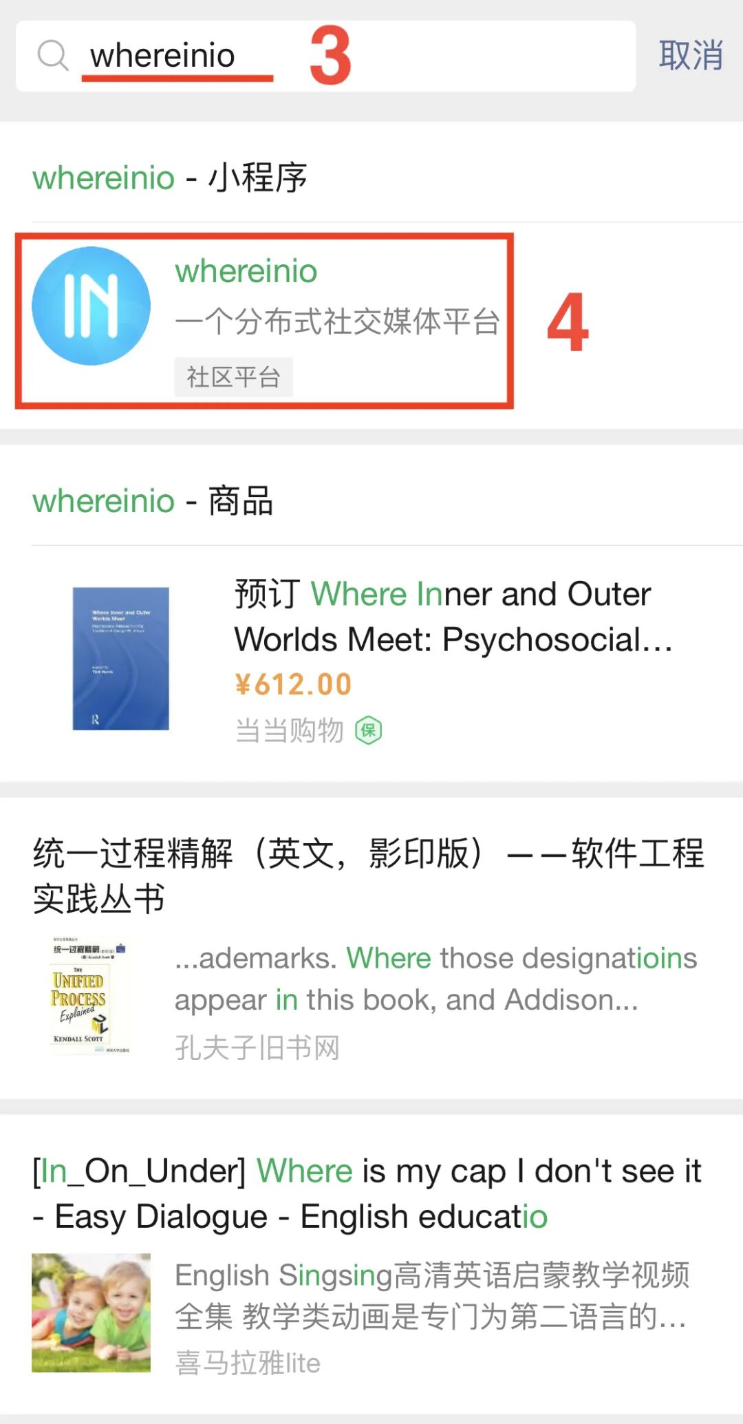 在搜索框中输入「whereinio」,轻点「whereinio小程序」