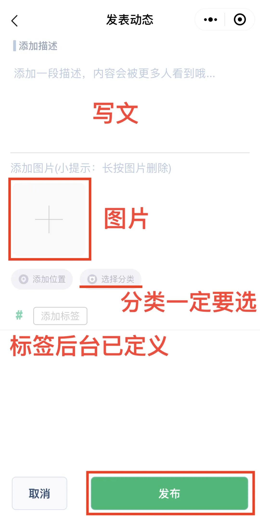 在动态发布页,按下图写下你要发布的动态,添加图片,选择好分类,添加好其在小程序上的标签,轻点「发布」,则动态发布成功