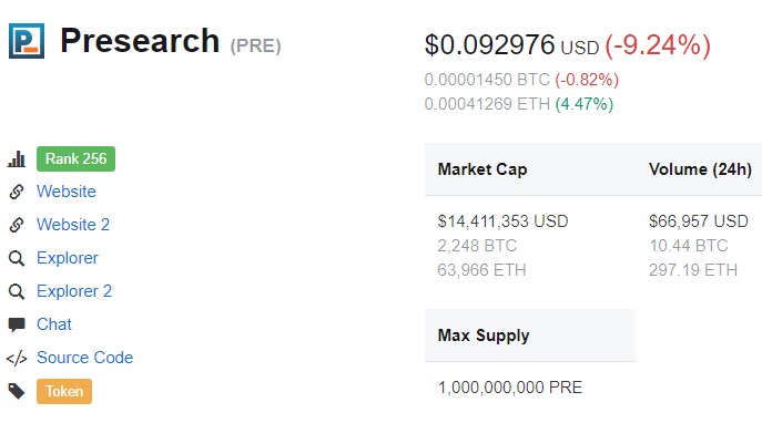Si, así como lo vez. Presearch es un buscador que tiene su propia criptomoneda, que al momento de escribir este post, cuenta con una capitalización de mercado de $14,411,353 unos 2,248 Bitcoin en precio actual.