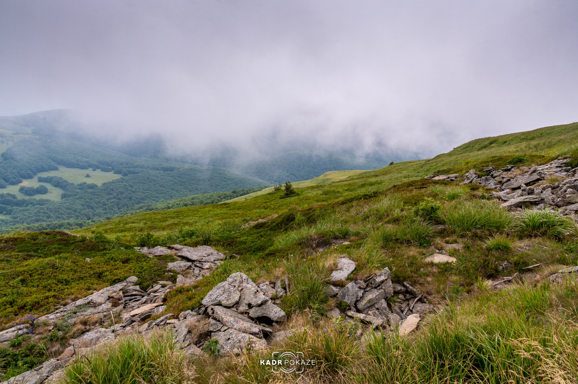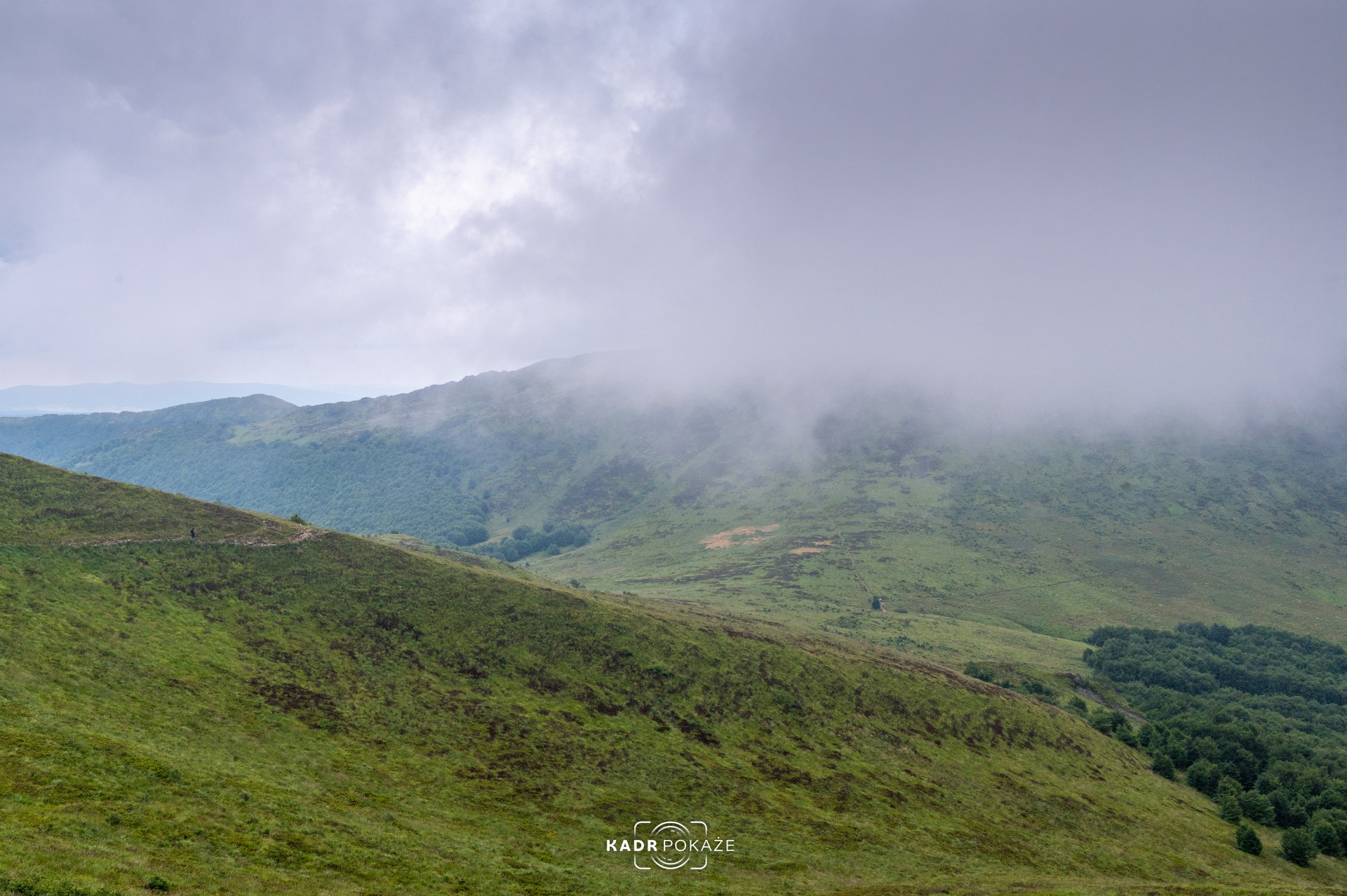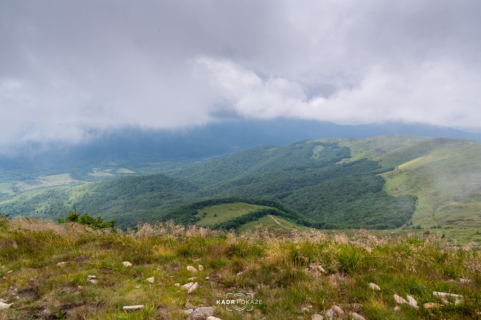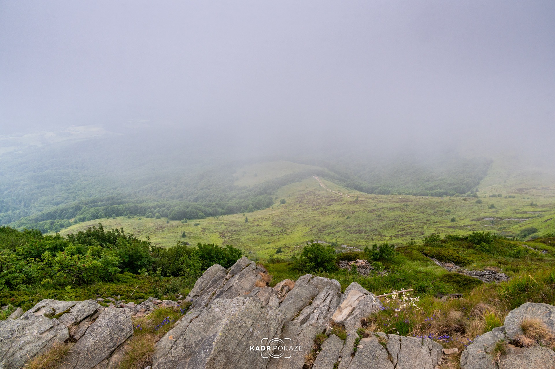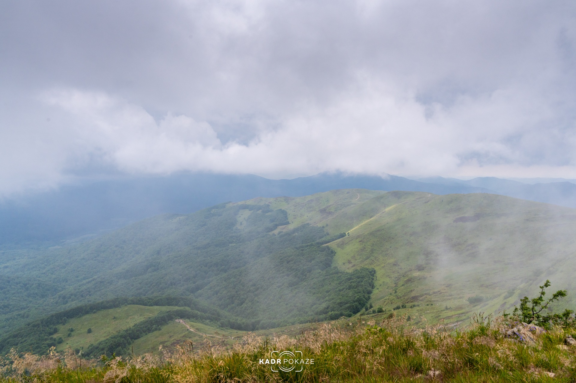 Po dotarciu na szczyt nie mieliśmy zbyt dobrej widoczności. Momentami wręcz nie było jej wcale. Tylko na krótkie momenty chmury i mgła się rozrzedzały odkrywając trochę Bieszczadzkiego piękna.
