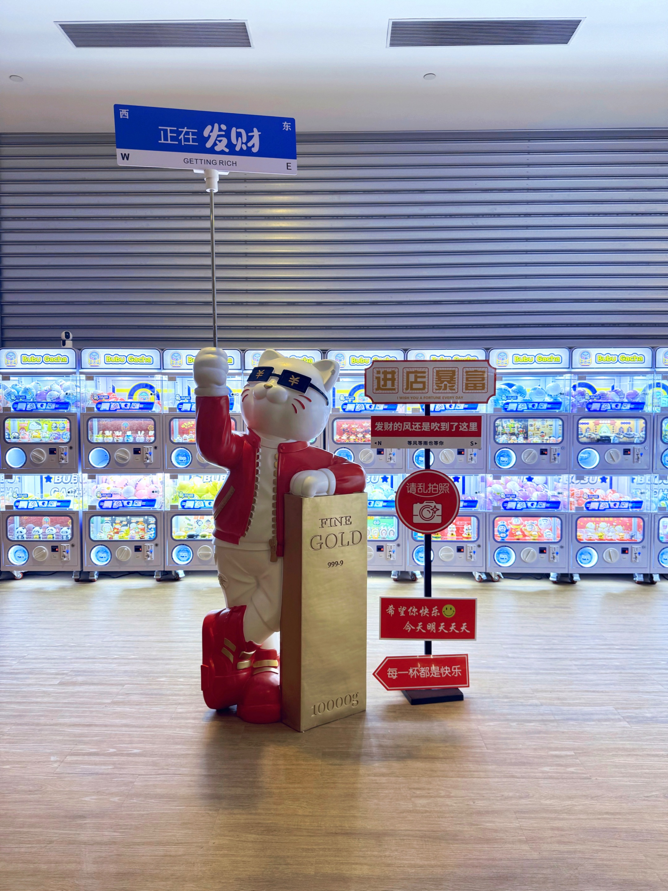 靠着金条的有钱猫雕像,旁边还有有趣的牌子,比如:「进店暴富」「发财的风还是吹到了这里」「请乱拍照📸」