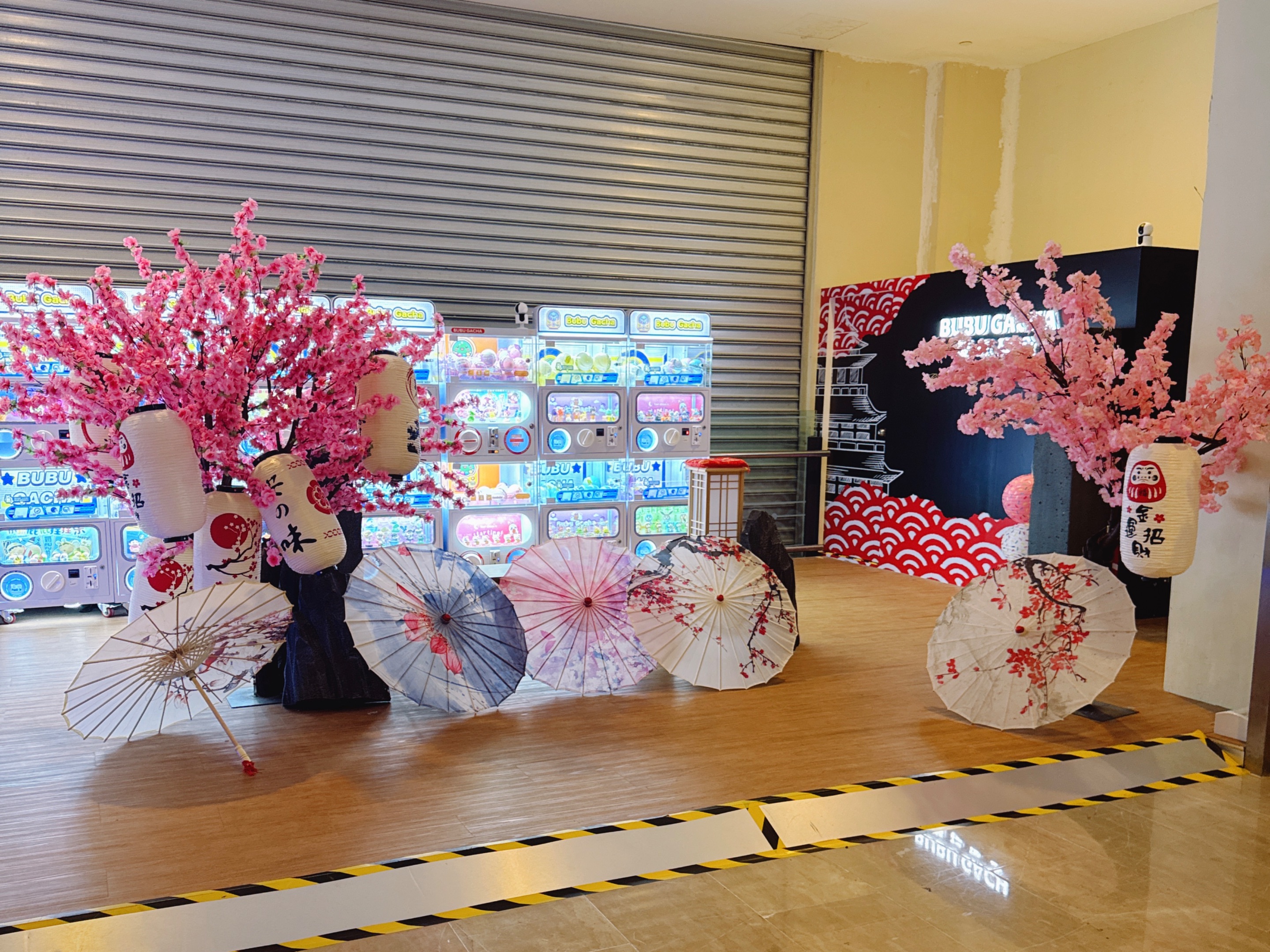 接下来就是这些日式的拍照打卡背景,有樱花树、日本伞、灯笼、还有像是日式寺庙的许愿平台。