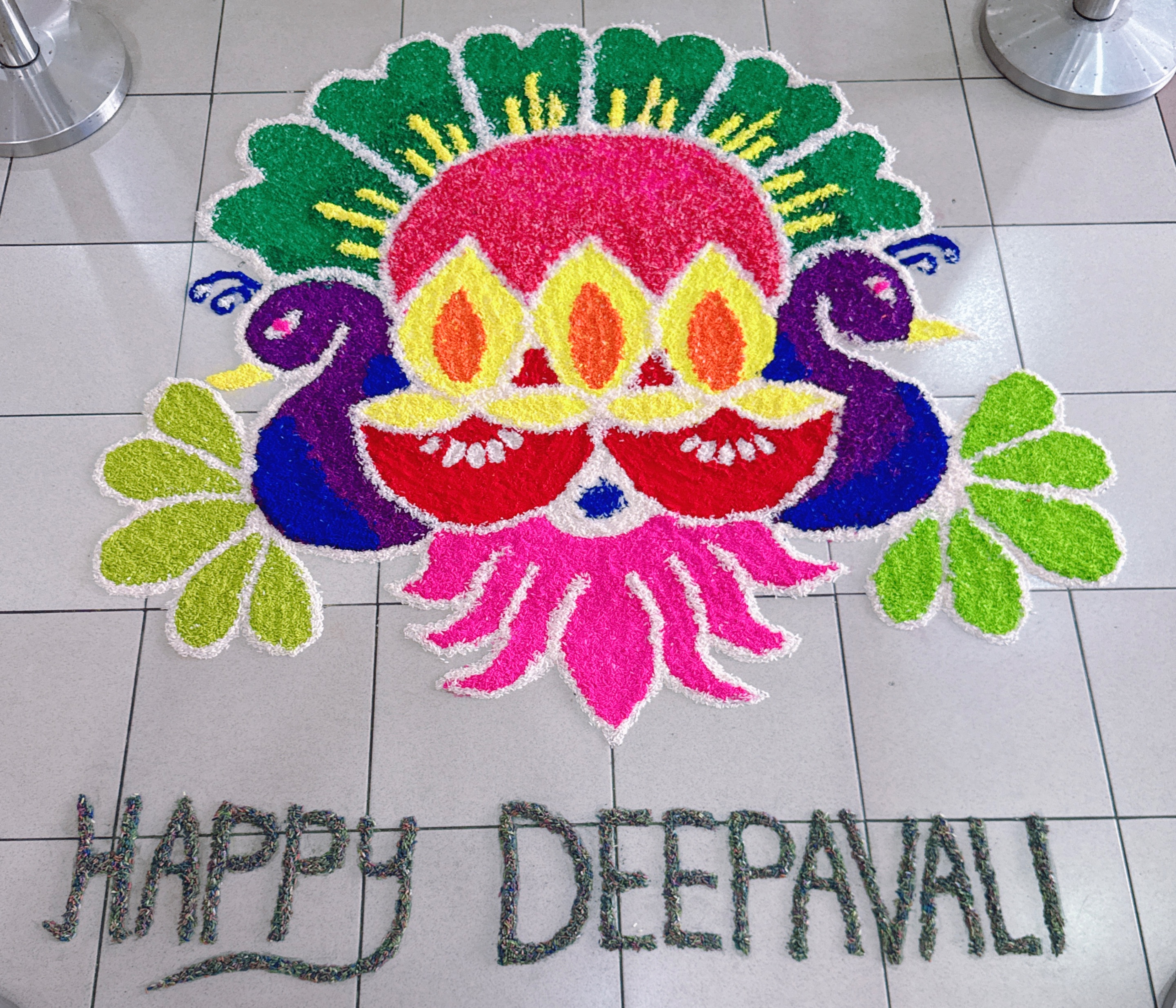 每到 Deepavali 节日,各个商场的大门口都会有 "彩米图",也叫 Kolam 或者 地画,算是一种传统涂鸦,用彩色的米在地上铺成一幅画。