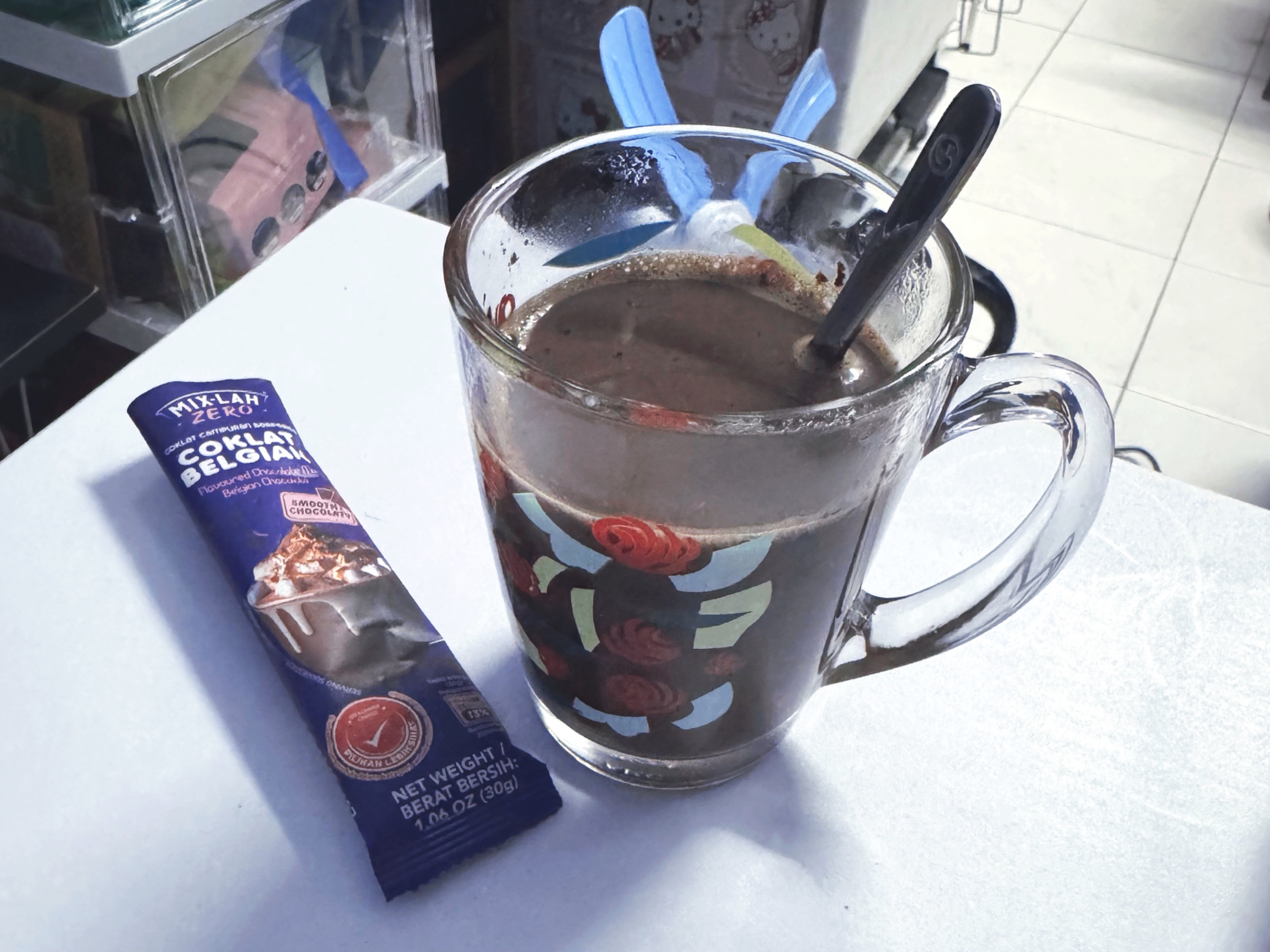 隔了好几天才喝的比利时巧克力,味道像是我平常冲泡的巧克力饮料。 -