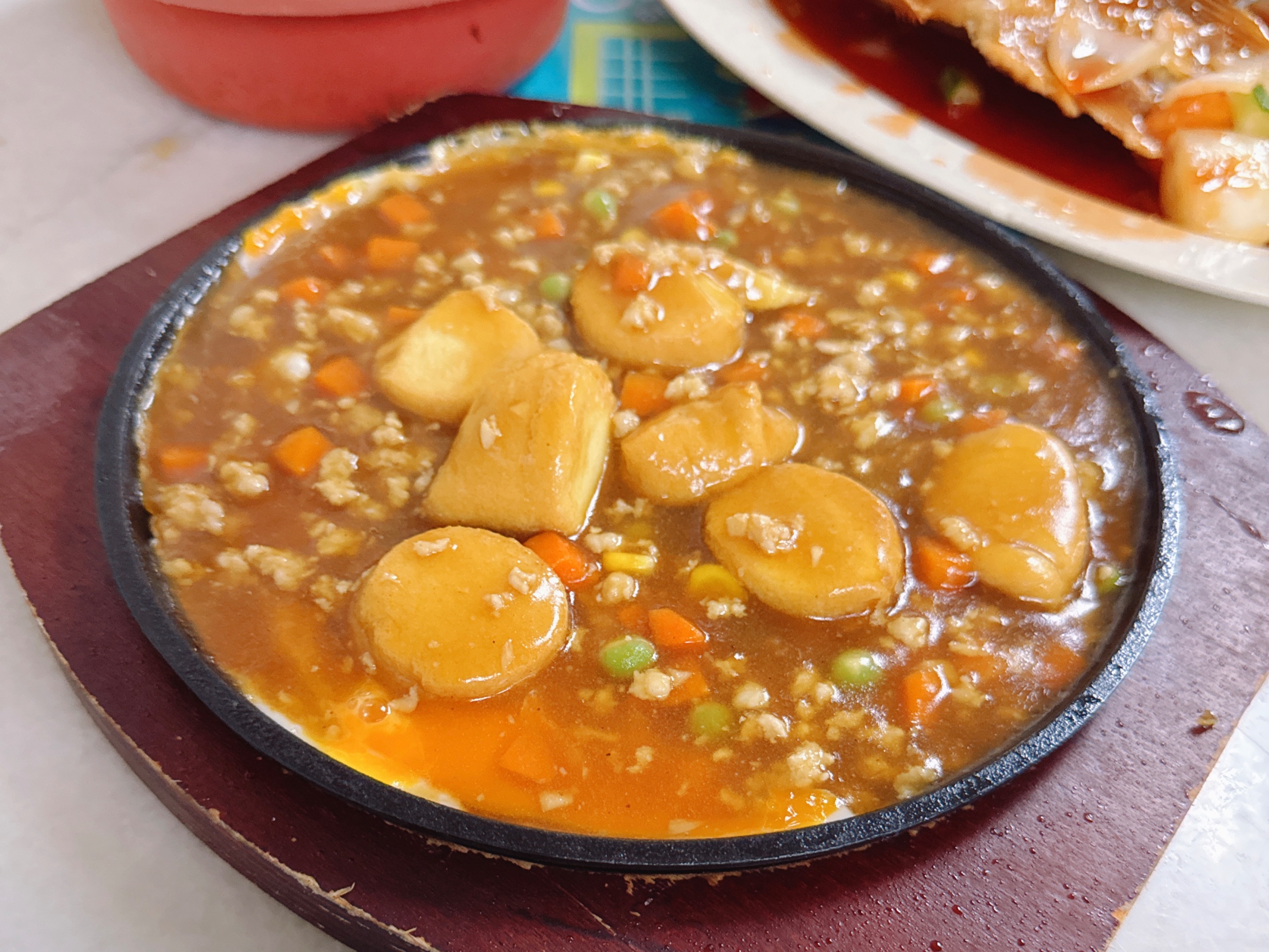 铁板豆腐,鸡蛋锅底加上肉碎和豆腐,味道还不错。