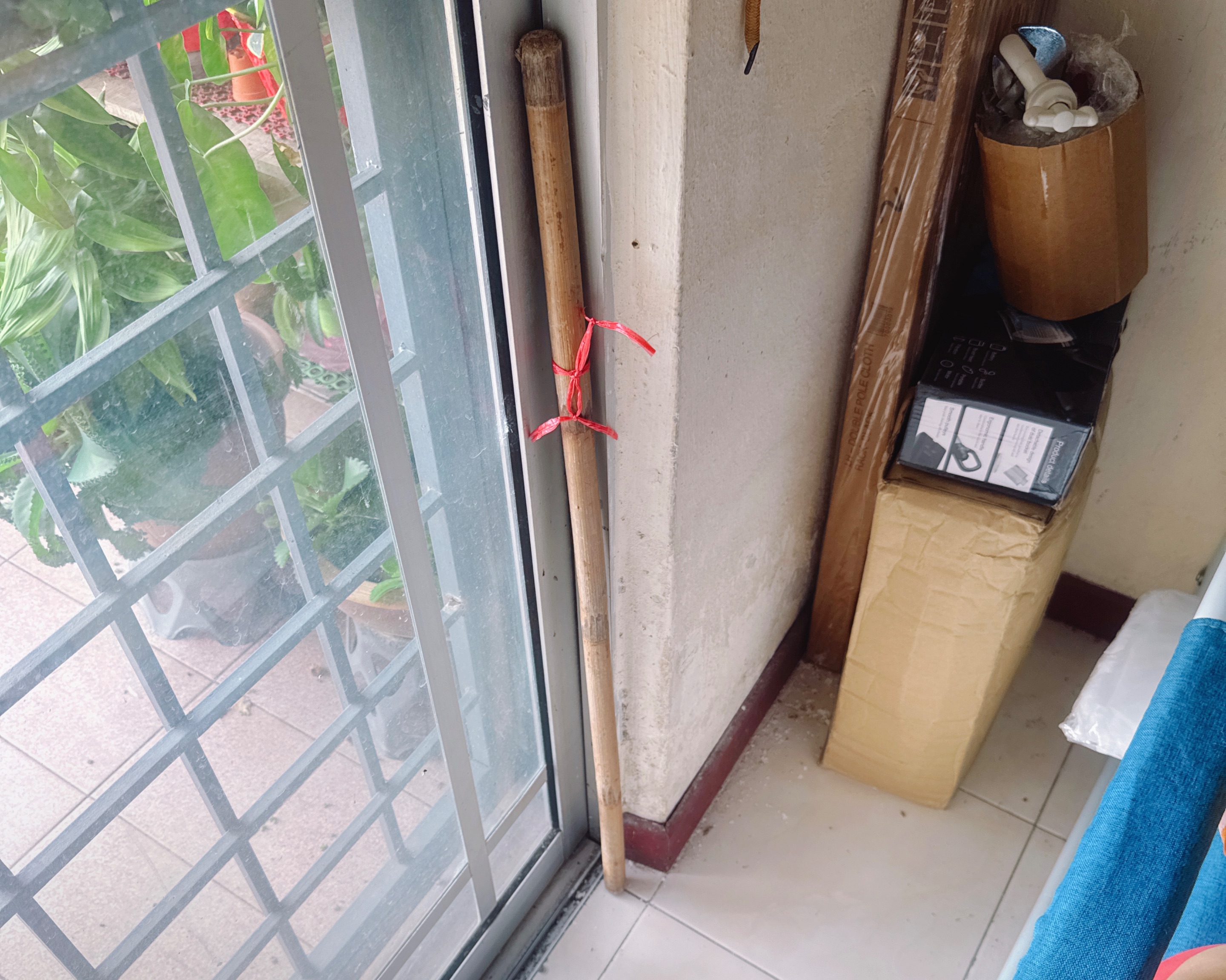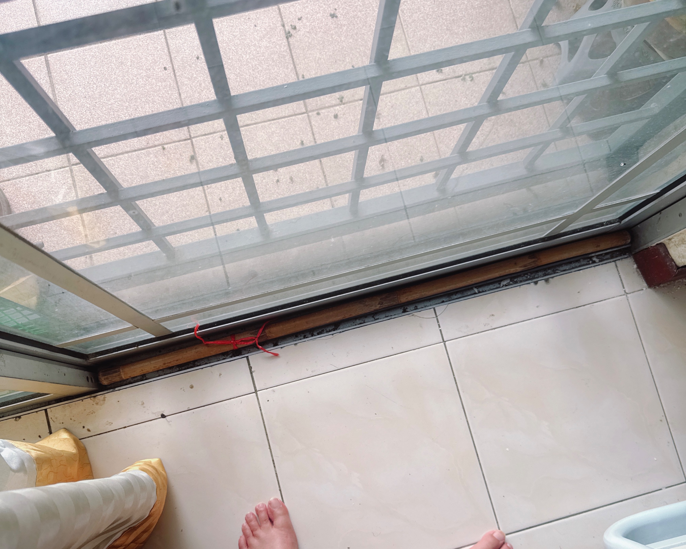 平时家里为了防贼,会在玻璃门下放置一根棍子,就像上图那样。今早我出门的时候就把棍子放成下图这样,也许是出门关门的时候,棍子自动滑下来把门给堵死了。