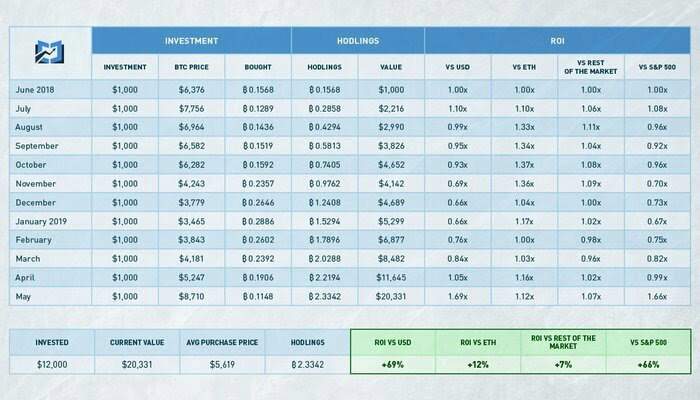 A team of crypto enthusiasts did a hypothetical DCA investment of Bitcoin with $1000 at the end of each month, starting last June 2018, for 12 months. The experiment ended 29th May 2019. Comparisons were made against $ETH, rest of crypto market, and the widely-used benchmark US-S&P500 index.