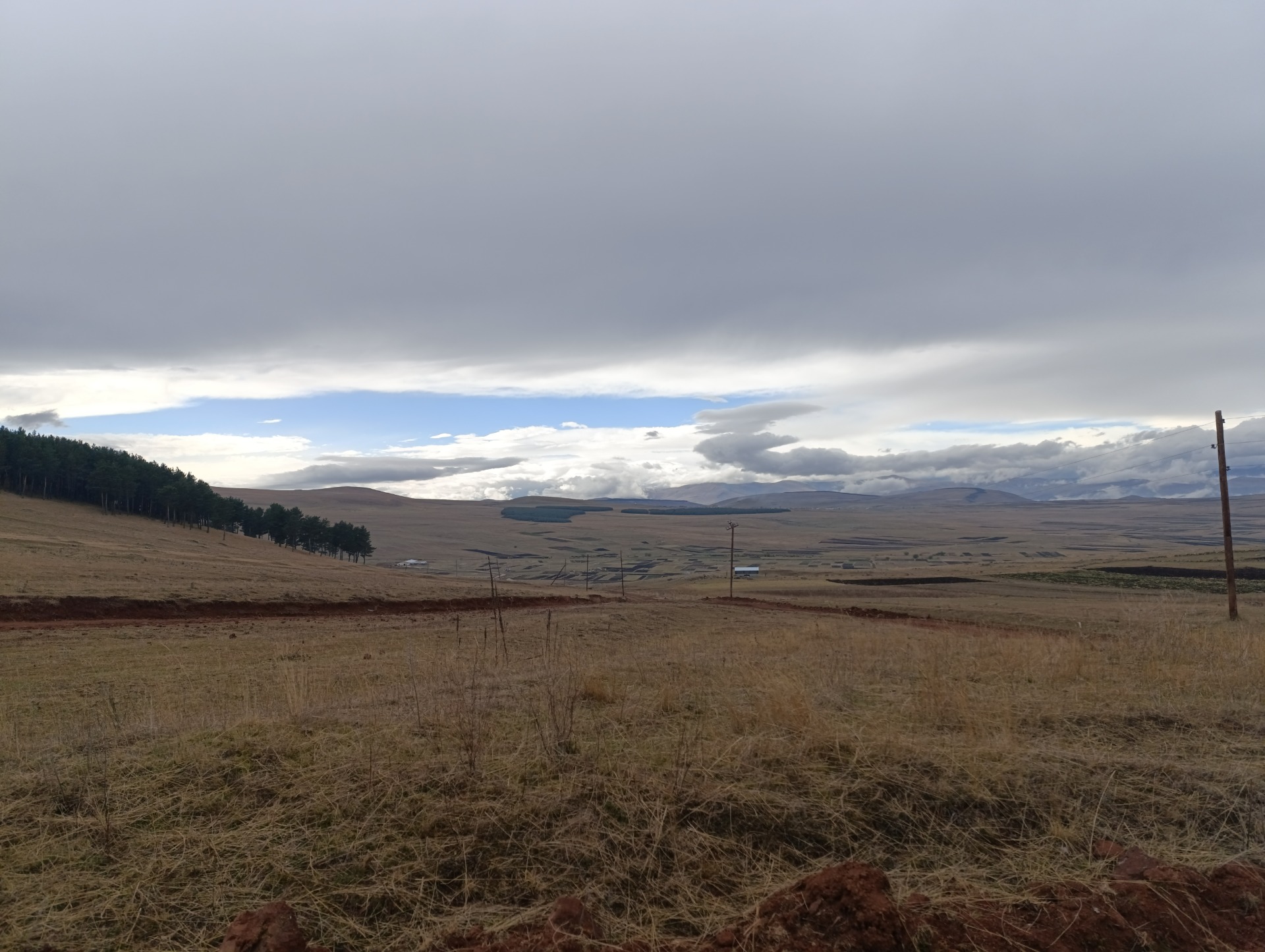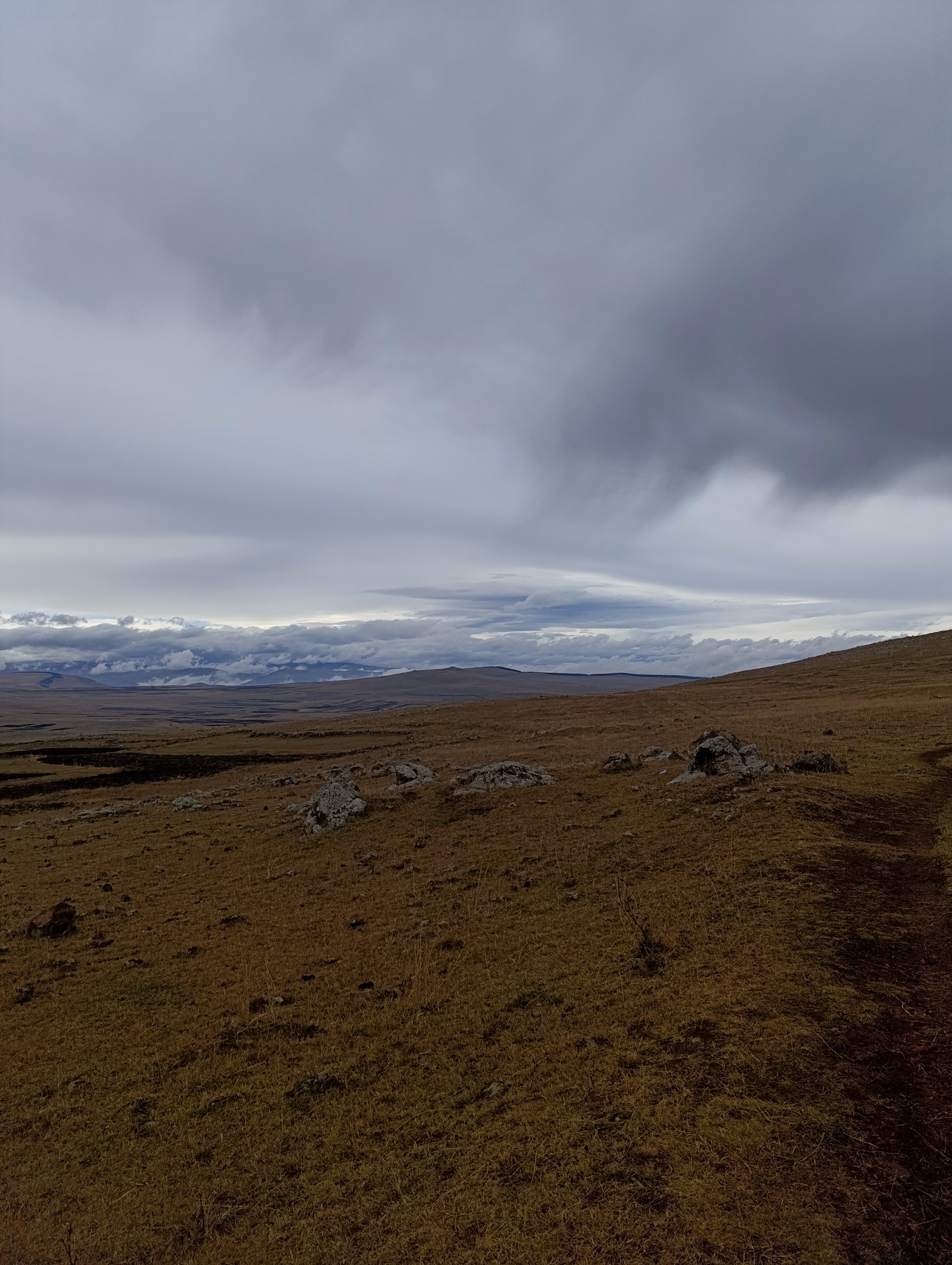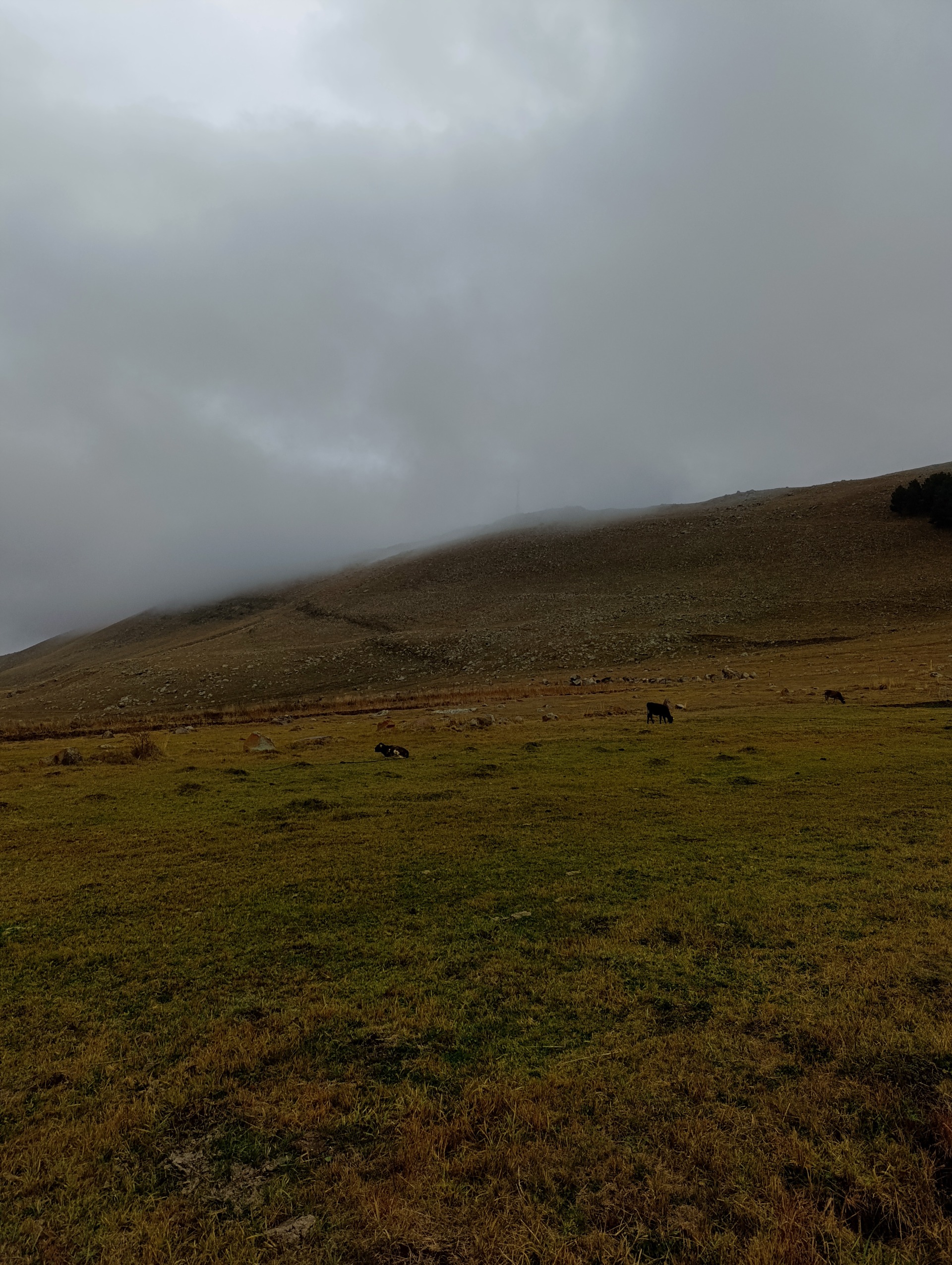 I didn't quite reach the top of this mountain, to the left it continued up higher. Though the area I reached levelled out. Beyond all I could see were the other little woodlands of pines. Tall grass which looked dry and dead. An environment unlike any other I had seen before. Scattered with bits of rock. No signs beyond of the life that was below, where little villages sat. No more sounds of little cars. No more sounds of cows. Just the wind that would blow. The little sounds of raindrops landing on my coat. The hike up the mountain had boosted my temperature up to some rather uncomfortable levels, though the cold air would still feel unpleasant on the ears. I wrapped a scarf around my head purely to address that issue and pressed forward, with more curiosity of what was ahead. No more homes. No farmland. Nothing. Though not too soon after, I checked the time. It was soon to get colder, the temperature to drop more with increased rain. As the sun would soon set.