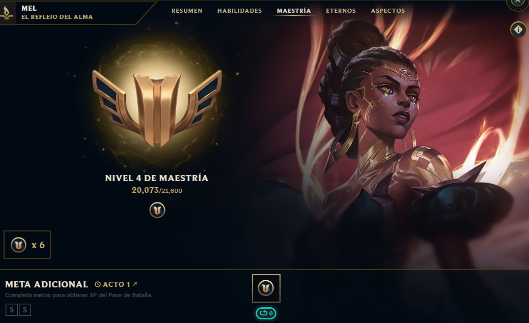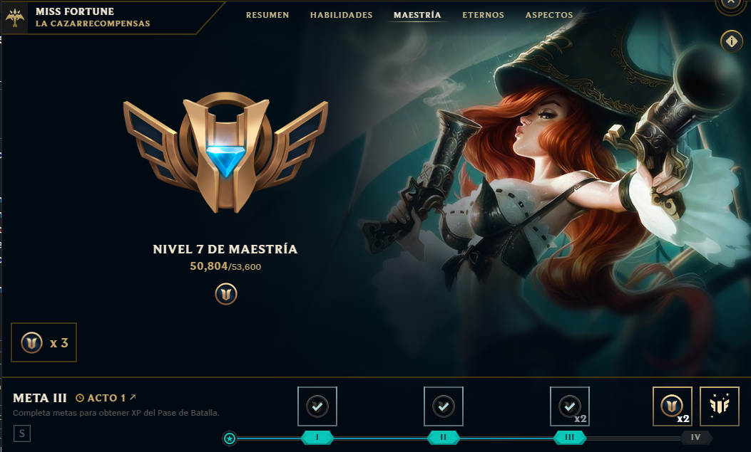 También estoy desbloqueando los **Eternos** con ciertos campeones que pretendo usar con más frecuencia. Por supuesto, **Miss Fortune** y **Mel** tuvieron prioridad y hasta ahora estos son mis avances con ella. Ahora en cuanto a la partida que les presento, la verdad nunca había visto a ningún participante haciendo trolleo tan descaradamente.